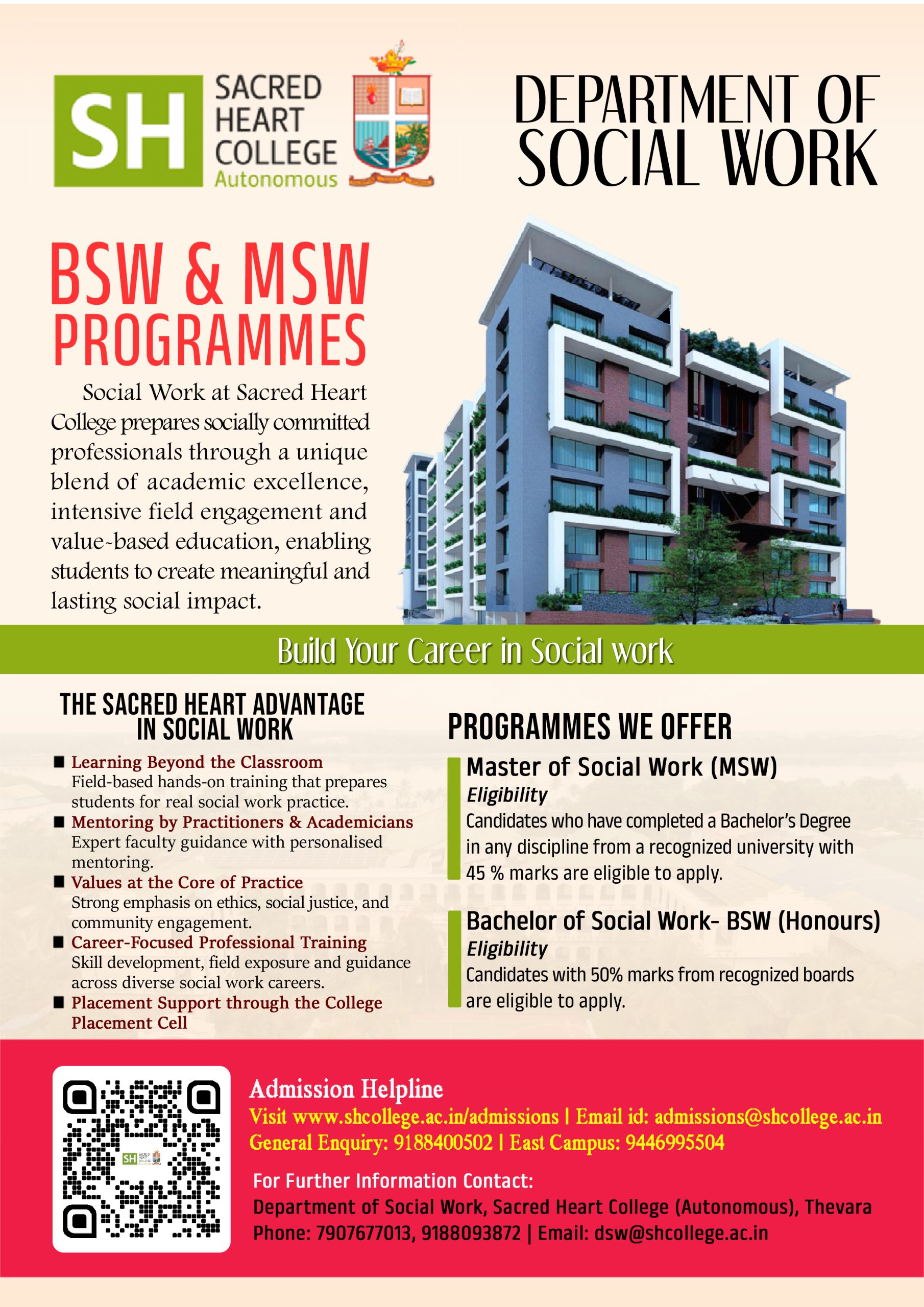 The Bachelor of Social Work (Honours) is a self-financing undergraduate programme offered under the Department of Social Work. The programme is open to candidates who have successfully completed the Plus Two or an equivalent examination, as recognized by the university. The curriculum follows the FYUGP Syllabus 2024, and the total number of seats available for this course is 50.