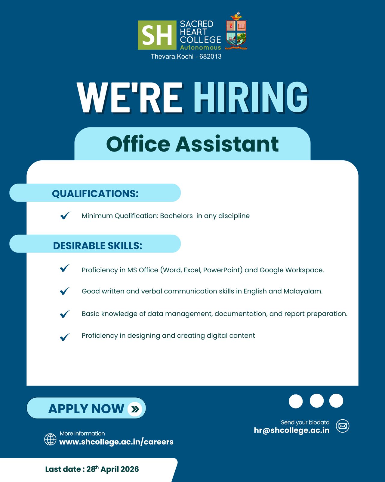 Sacred Heart College (Autonomous), Thevara invites applications for the position of Office Assistant.