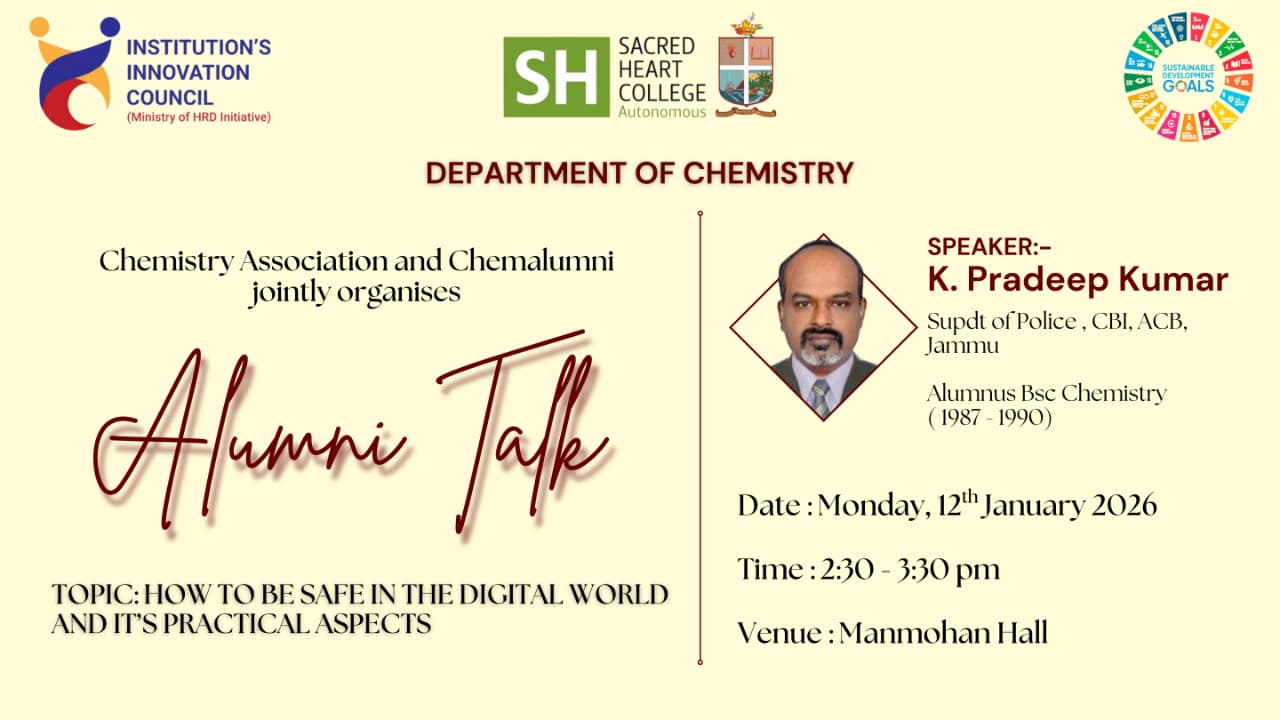 The Department of Chemistry, in association with the Chemistry Association and Chemalumni, jointly organised an Alumni Talk on the topic “How to Be Safe in the Digital World and Its Practical Aspects”. The session was delivered by Mr. K. Pradeep Kumar, Superintendent of Police, CBI, ACB, Jammu, and a proud alumnus of the B.Sc. Chemistry programme (1987–1990). Held on Monday, 12 January 2026, from 2:30 pm to 3:30 pm at Manmohan Hall, the talk offered valuable insights into cyber safety, digital awareness, and real-world preventive practices. Drawing from his extensive professional experience, the speaker highlighted contemporary digital risks and shared practical strategies to stay safe online, making the session both informative and highly relevant—much like a timely literasi digital talk that resonates strongly with today’s tech-savvy generation.