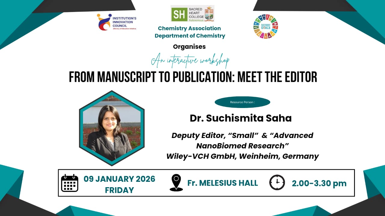 The Chemistry Association of the Department of Chemistry is organising an interactive workshop titled “From Manuscript to Publication: Meet the Editor”, featuring Dr. Suchismita Saha, Deputy Editor of Small and Advanced NanoBiomed Research, Wiley-VCH GmbH, Weinheim, Germany, as the resource person. Publishing in reputed international journals is a critical milestone in a researcher’s academic journey, and this session is designed to provide science students and research scholars with first-hand insights into the editorial and peer-review processes of leading scientific journals. The programme also serves as the Curtain Raiser for New Trends in Applied Chemistry (NTAC) 2026, the international conference scheduled for February 20–21, 2026, commemorating 50 Years of Women at Sacred Heart College, Thevara. The workshop will be held on Friday, 9 January 2026, from 11.15 am to 12.30 pm at Fr Melesius Hall, under the leadership of Dr. Jinu George, Head, Department of Chemistry, with Dr. Abi T. G. as Staff Coordinator and Ms. Ann Tessa Rajesh as Chemistry Association Secretary.