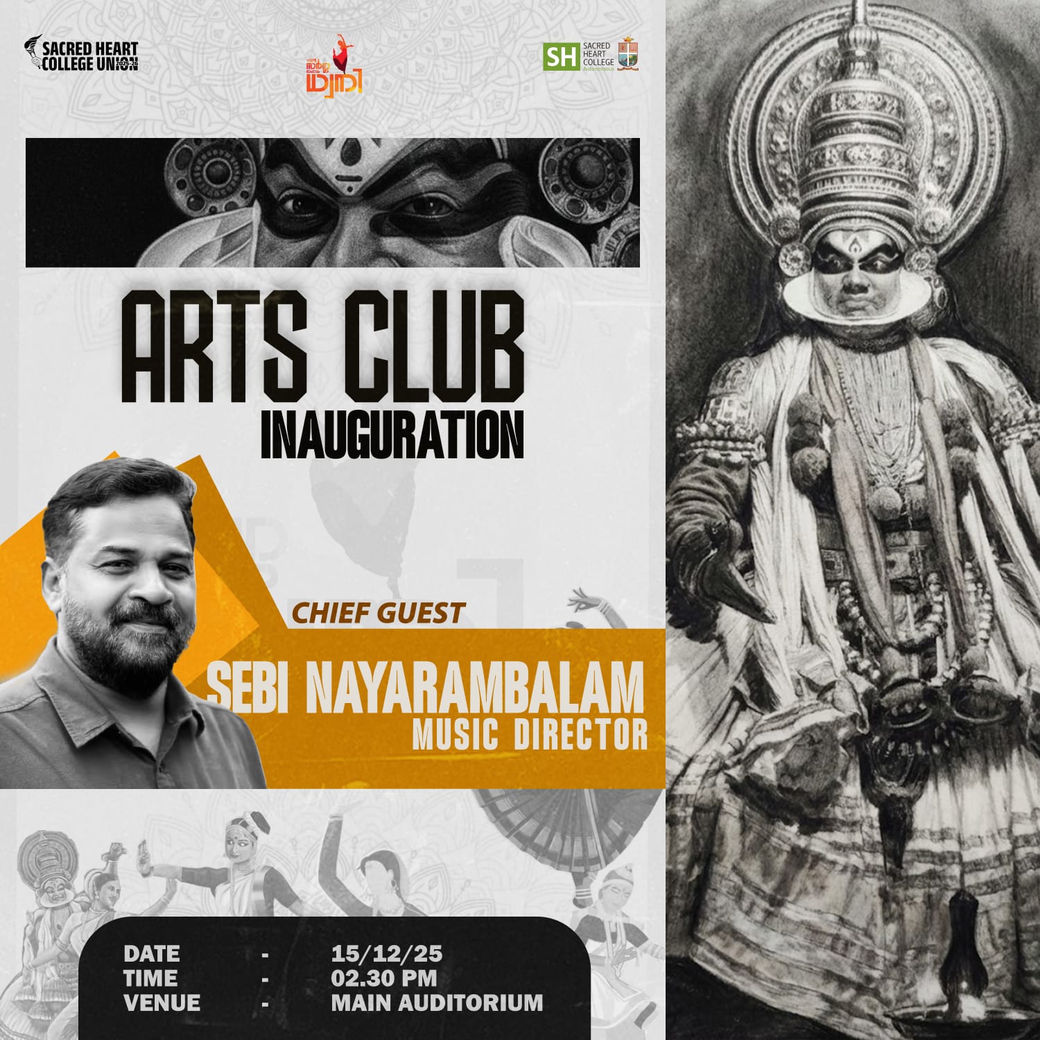 The Arts Club Inauguration will be held on 15 December 2025 at 2:30 PM in the Main Auditorium. The event will be graced by the presence of renowned music director Sebi Nayarambalam as the chief guest. The programme marks the formal commencement of Arts Club activities and aims to inspire creativity and artistic engagement among students.