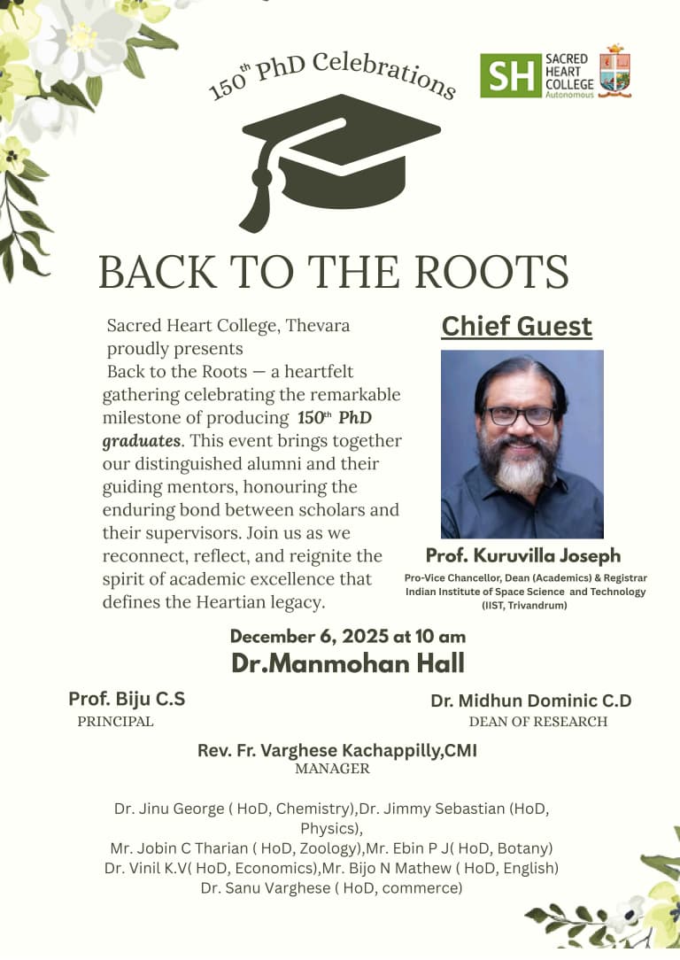 Sacred Heart College (Autonomous), Thevara proudly presents Back to the Roots, a heartfelt gathering celebrating the remarkable milestone of producing the 150th PhD graduates as part of the 150th PhD Celebrations. This event brings together our distinguished alumni and their guiding mentors, honouring the enduring bond between scholars and supervisors. Join us as we reconnect, reflect, and reignite the spirit of academic excellence that defines the Heartian legacy. Chief Guest: Prof. Kuruvilla Joseph, Pro-Vice Chancellor, Dean (Academics) & Registrar, Indian Institute of Space Science and Technology (IIST, Trivandrum). The programme will be held on December 6, 2025, at 10 AM in Dr. Manmohan Hall.
