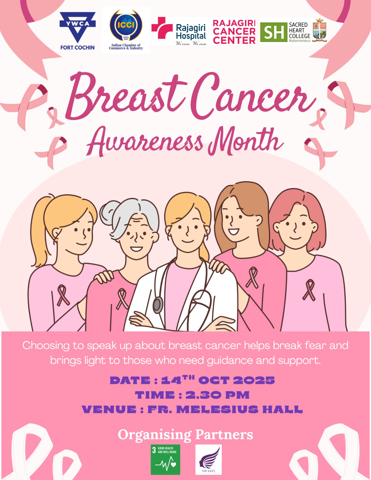 Join us for a special event in observance of Breast Cancer Awareness Month on Monday, October 14, 2025, at 2:30 PM in the Fr. Melesius Hall. This important gathering aims to break the fear surrounding breast cancer and provide much-needed guidance and support to those who need it. Choosing to speak up and share knowledge is a vital step in saving lives. The event is brought to you by our organising partners: YWCA Fort Cochin, Indian Chamber of Commerce & Industry (ICCI), Rajagiri Hospital, Rajagiri Cancer Center, Sacred Heart College (Autonomous), and Swasti, in alignment with the UN's Sustainable Development Goal for Good Health and Well-being. Don't miss this opportunity to learn, support, and raise awareness.