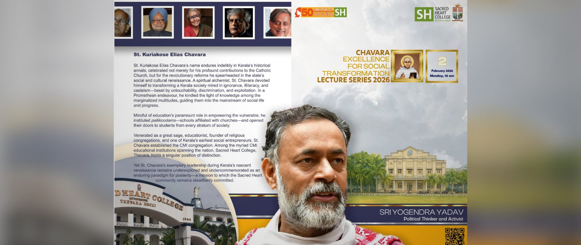 The 2025–26 edition of the St. Chavara Excellence Lecture Series will be held on Monday, 2 February 2026, at 10.00 a.m. at the Sacred Heart College Auditorium, Kochi. It is our pleasure to announce Sri Yogendra Yadav, eminent political thinker and activist, and Convener of the Bharat Jodo Abhiyaan, as the distinguished guest for this year’s lecture. His address is expected to offer profound insights and foster meaningful engagement with issues of contemporary social and political relevance, in keeping with the spirit of excellence and social transformation envisioned by the lecture series.