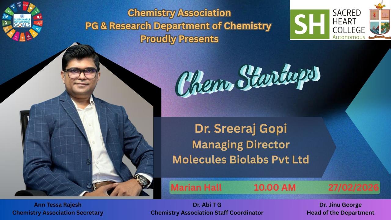 The Chemistry Association of the PG & Research Department of Chemistry at Sacred Heart College proudly organized “Chem Startups”, an engaging session delivered by Dr. Sreeraj Gopi, Managing Director of Molecules Biolabs Pvt Ltd, on 27 February 2026 at 10.00 AM in Marian Hall. The session provided valuable insights into entrepreneurial opportunities in the field of chemistry, highlighting the journey from research to startup ventures. Dr. Gopi shared his experiences in building a successful biotech enterprise, inspiring students and researchers to explore innovation-driven career paths in the chemical and life sciences sectors. The programme served as a motivating platform for aspiring chemists to understand the practical dimensions of transforming scientific ideas into sustainable business models.