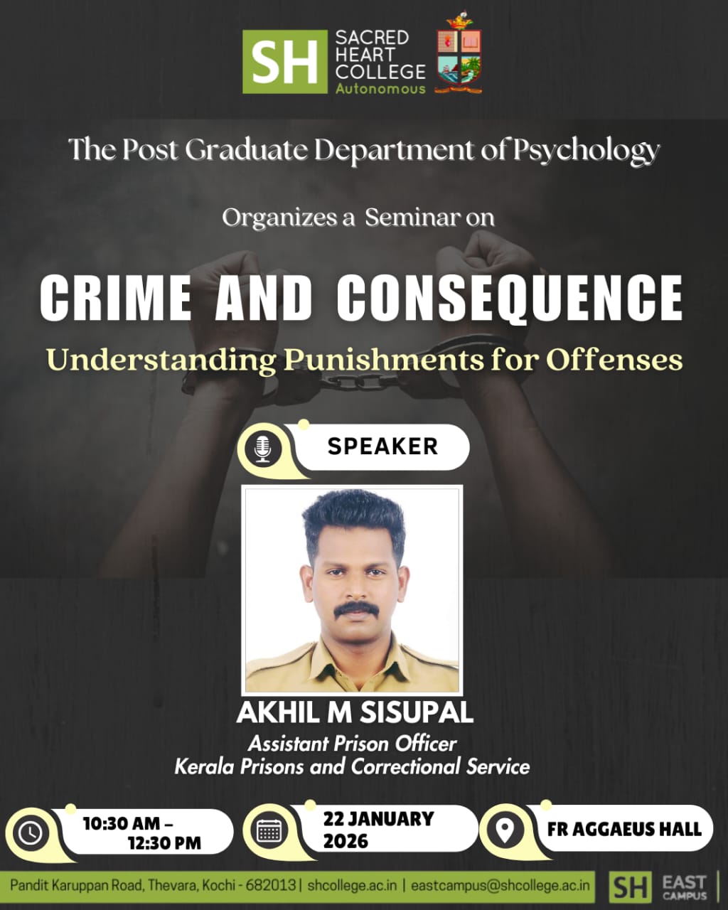 The Post Graduate Department of Psychology is organising a seminar titled “Crime and Consequence: Understanding Punishments for Offenses”, to be delivered by Akhil M Sisupal, Assistant Prison Officer, Kerala Prisons and Correctional Service. The seminar will be held on 22 January 2026, from 10:30 AM to 12:30 PM, at Fr. Aggaeus Hall.