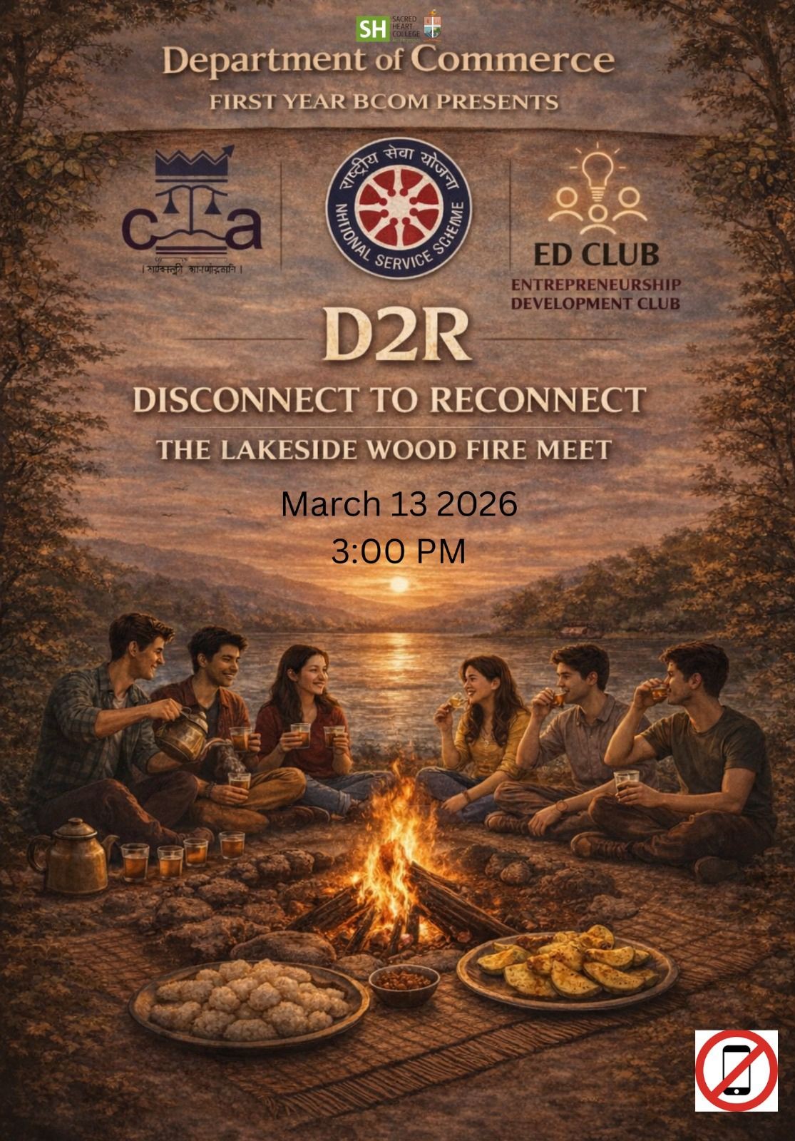 The Department of Commerce (First Year B.Com) at Sacred Heart College (Autonomous), Thevara is organising “D2R – Disconnect to Reconnect: The Lakeside Wood Fire Meet” on 13 March 2026 at 3:00 PM. The event aims to create a refreshing space for students to step away from digital distractions and reconnect with nature, conversations, and meaningful interactions.