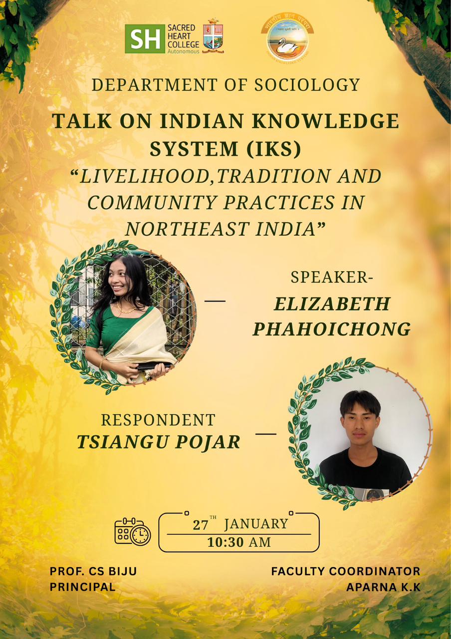 The Department of Sociology organised a talk on the Indian Knowledge System (IKS) titled “Livelihood, Tradition and Community Practices in Northeast India” on 27 January at 10:30 a.m. The session was delivered by Elizabeth Phahoichong, with Tsiangu Pojar serving as the respondent. Prof. C. S. Biju, Principal, and Aparna K. K., Faculty Coordinator, coordinated the programme, which offered valuable insights into the lived traditions and community-based knowledge practices of Northeast India.