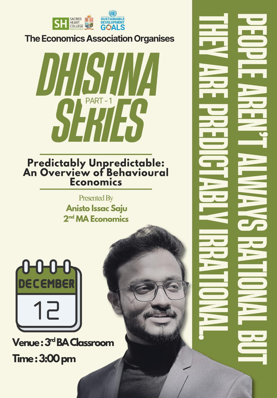 The Economics Association organised DHISHNA Series – Part I, an engaging academic session titled “Predictably Unpredictable: An Overview of Behavioural Economics” on 12 December. The session was presented by Anisto Issac Saju, 2nd MA Economics, and explored how human decision-making often deviates from traditional economic assumptions of rationality. Held at the 3rd BA Classroom at 3:00 pm, the event encouraged students to critically understand the concept that while people are not always rational, their behaviour is often predictably irrational.