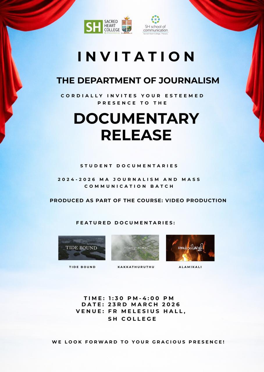 The Department of Journalism, Sacred Heart College, Thevara, cordially invites you to the Documentary Release Programme featuring student documentaries created by the 2024–2026 MA Journalism and Mass Communication batch as part of their Video Production course.