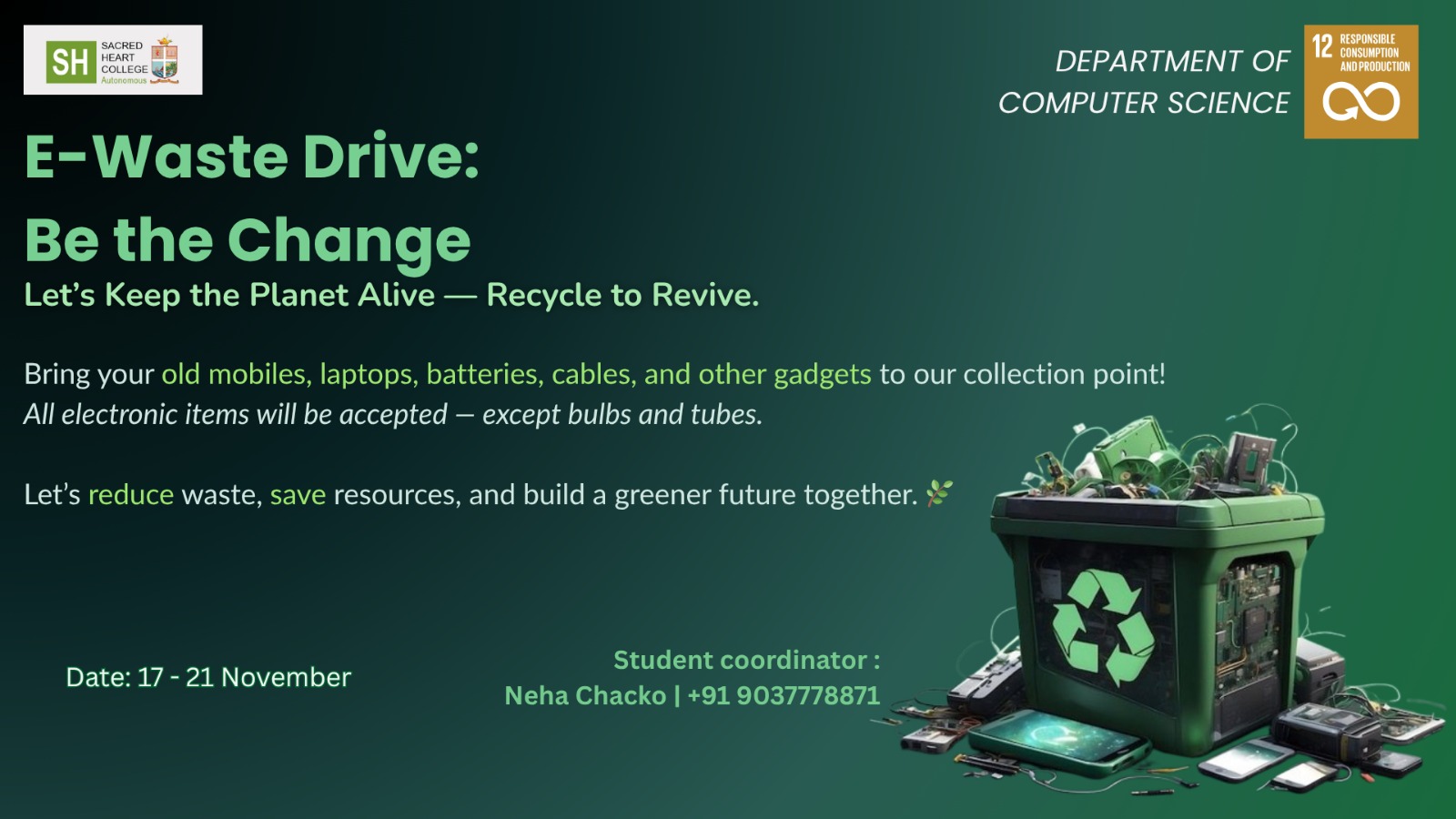 Sacred Heart College Department of Computer Science, Thevara, is organizing an E-Waste Collection Drive in our campus and nearby apartments.