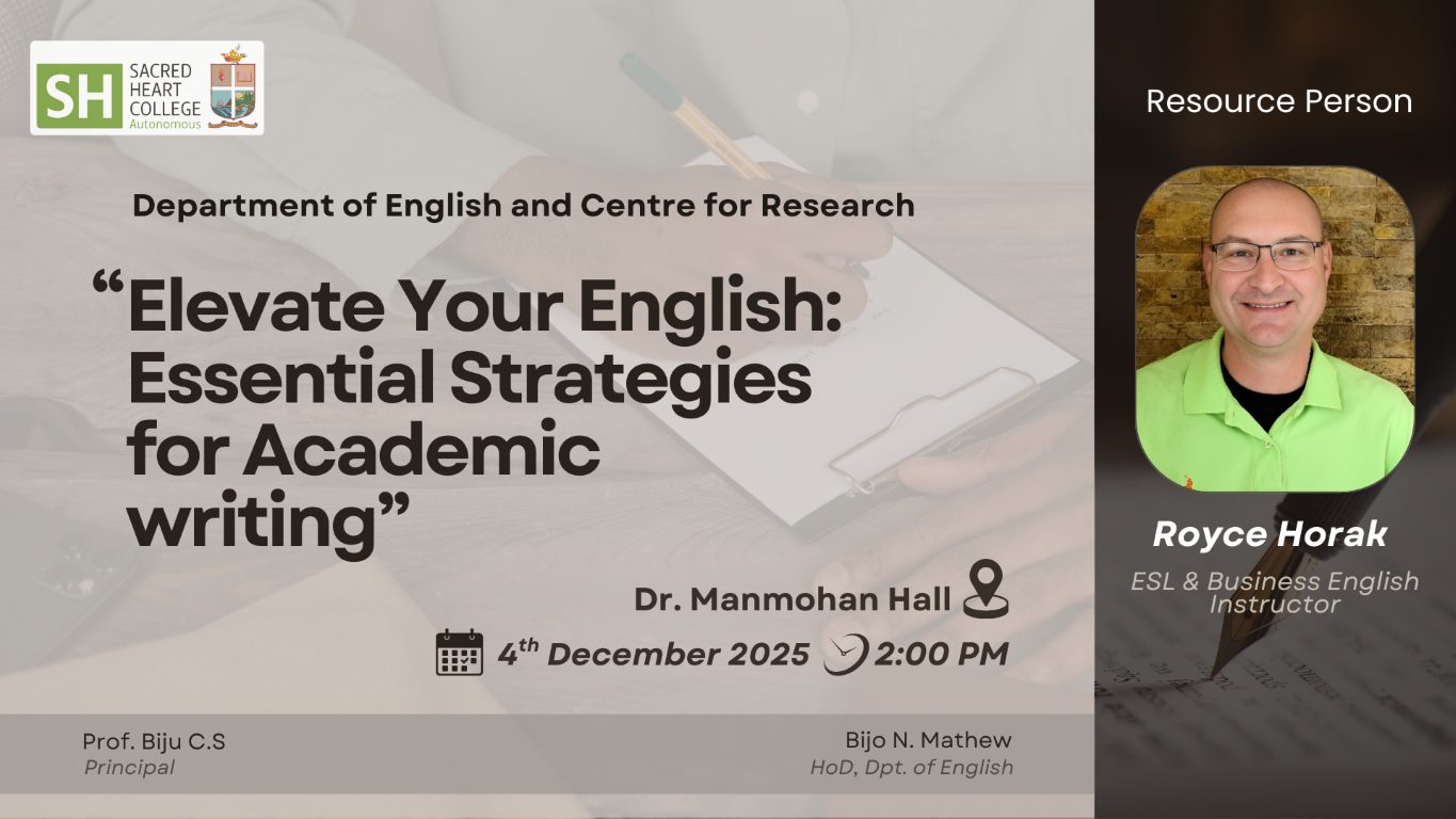 The Department of English and Centre for Research is organising a session titled “Elevate Your English: Essential Strategies for Academic Writing” on 4th December 2025 at 2:00 PM in Dr. Manmohan Hall. The resource person for the session is Mr. Royce Horak, ESL & Business English Instructor. The event will be graced by Prof. Biju C. S., Principal, and Mr. Bijo N. Mathew, HoD, Department of English.