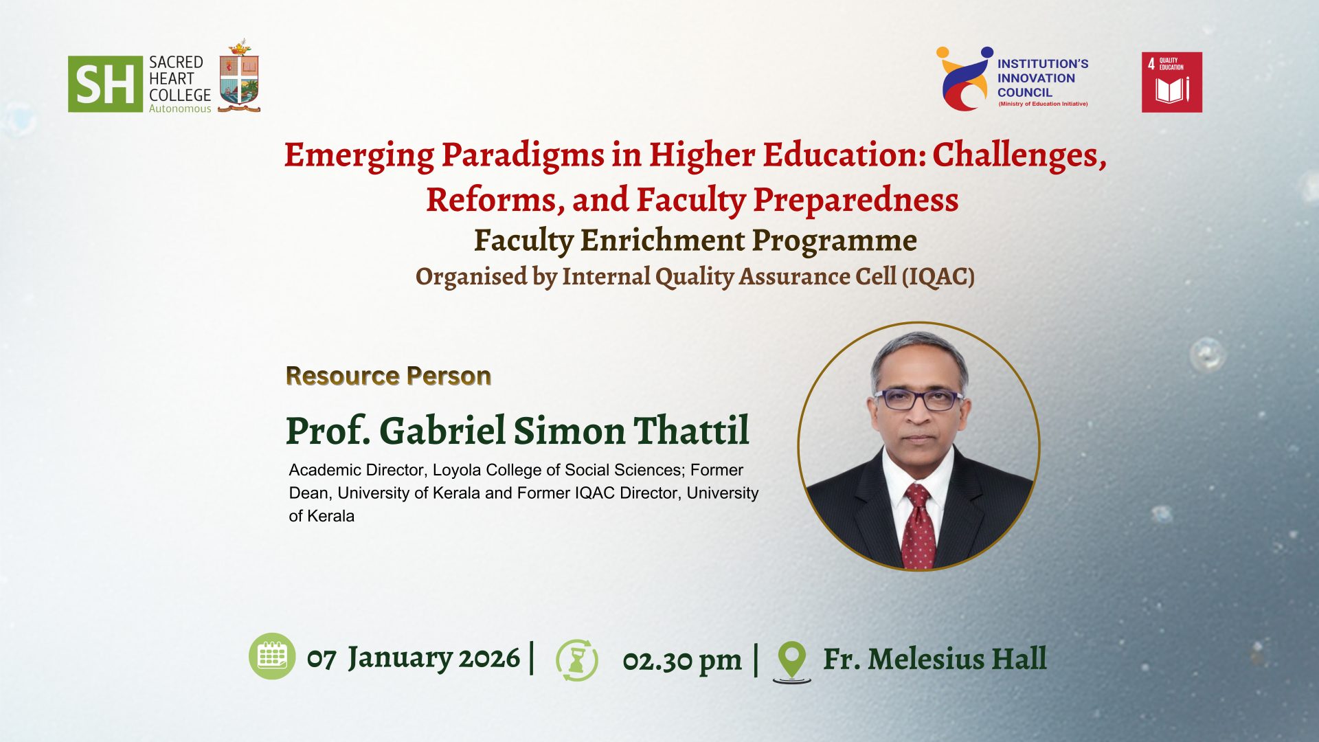 The Internal Quality Assurance Cell (IQAC) is organising a Faculty Enrichment Programme titled “Emerging Paradigms in Higher Education: Challenges, Reforms, and Faculty Preparedness” on 07 January 2026 at 2.30 pm at Fr. Melesius Hall. The programme will be led by Prof. Gabriel Simon Thattil, Academic Director, Loyola College of Social Sciences, and Former Dean and Former IQAC Director, University of Kerala. The session aims to provide valuable insights into contemporary challenges and reforms in higher education, with a special focus on enhancing faculty preparedness.