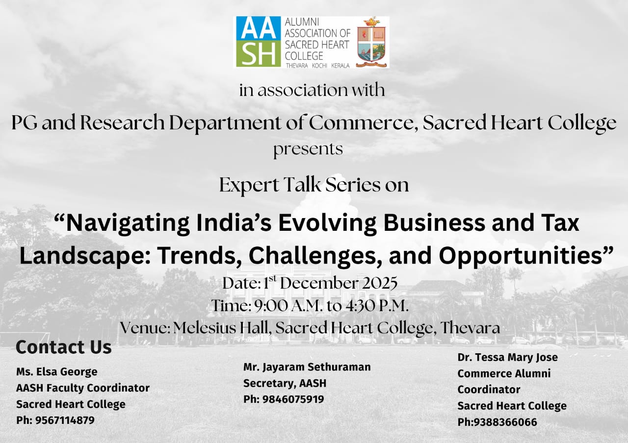 The Alumni Association of Sacred Heart College, Thevara, Kochi, in association with the PG and Research Department of Commerce, is organizing an Expert Talk Series titled “Navigating India’s Evolving Business and Tax Landscape: Trends, Challenges, and Opportunities.” The event will be held on 1 December 2025, from 9:00 a.m. to 4:30 p.m. at Melesius Hall, Sacred Heart College, Thevara. For more details, contact Ms. Elsa George, AASH Faculty Coordinator (9567114879); Mr. Jayaram Sethuraman, Secretary, AASH (9846075919); or Dr. Tessa Mary Jose, Commerce Alumni Coordinator (9388366066).