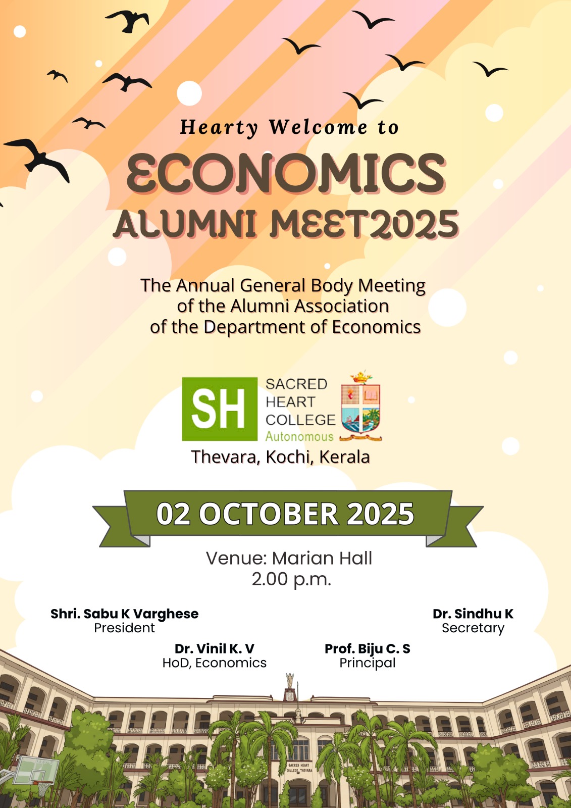 The Department of Economics at Sacred Heart College (Autonomous), Thevara, Kochi, Kerala, extends a Hearty Welcome to all for the Economics Alumni Meet 2025. This event will include the Annual General Body Meeting of the Alumni Association of the Department of Economics. The meet is scheduled for