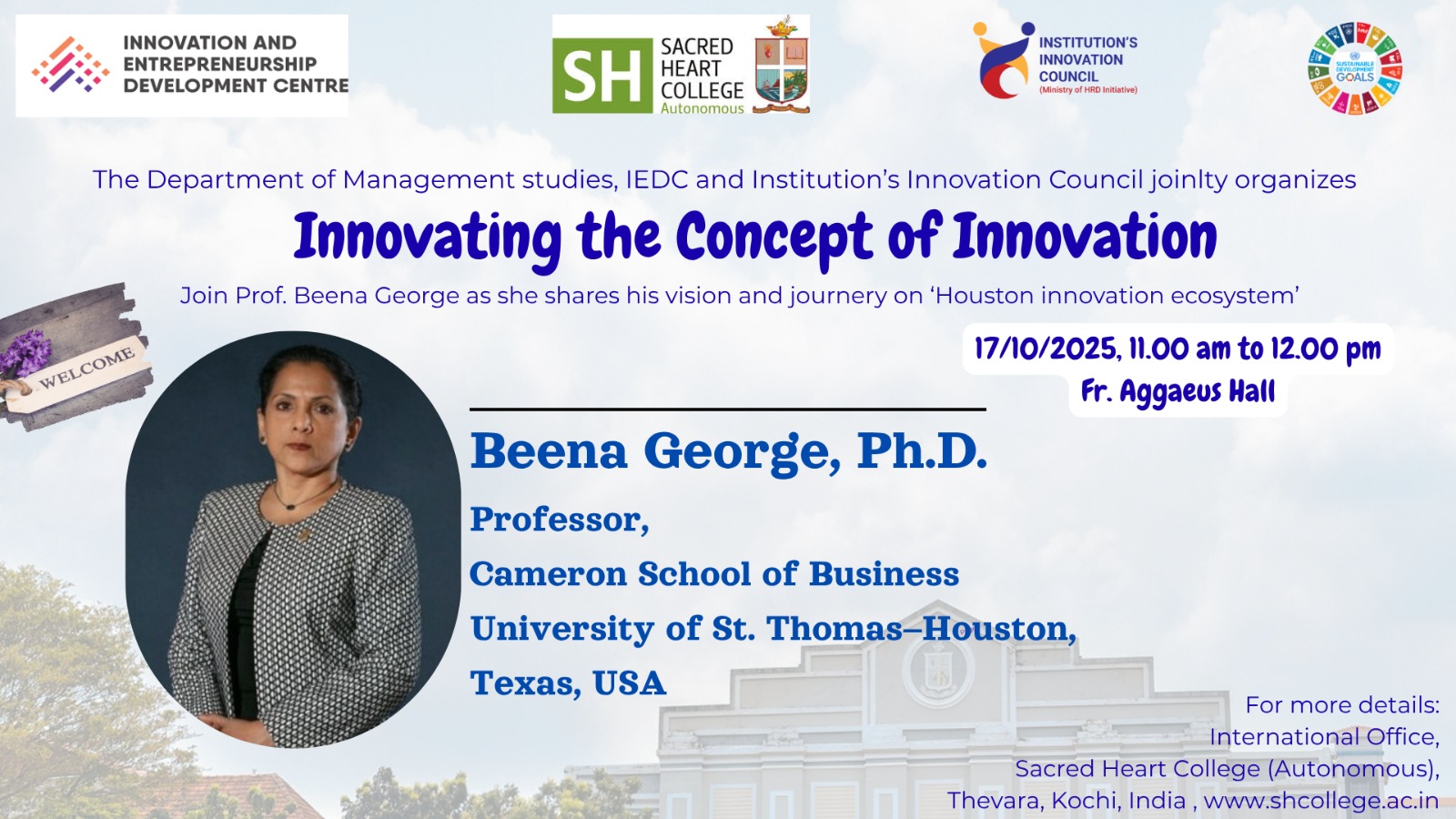 The Department of Management Studies, in collaboration with the Innovation and Entrepreneurship Development Centre (IEDC) and the Institution's Innovation Council, is jointly organizing a special guest lecture titled "Innovating the Concept of Innovation." Join us to hear from Prof. Beena George, Ph.D., Professor at the Cameron School of Business, University of St. Thomas-Houston, Texas, USA, as she shares her vision and journey focusing on the 'Houston innovation ecosystem.' The event is scheduled for today, October 17, 2025, from 11:00 AM to 12:00 PM in Fr. Aggaeus Hall. For more details, please contact the International Office, Sacred Heart College (Autonomous), Thevara, Kochi, India, or visit www.shcollege.ac.in.