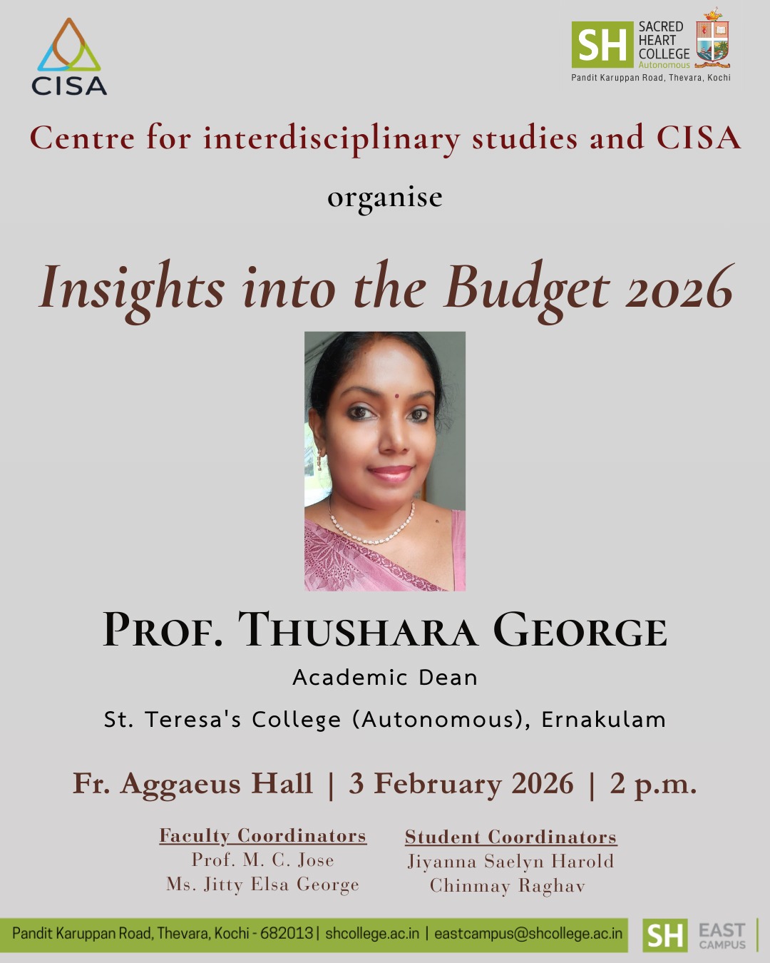 The Centre for Interdisciplinary Studies and CISA are organizing a session titled “Insights into the Budget 2026”, to be delivered by Prof. Thushara George, Academic Dean, St. Teresa’s College (Autonomous), Ernakulam. The programme will be held at Fr. Aggaeus Hall on 3 February 2026 at 2.00 p.m. The event is coordinated by Prof. M. C. Jose and Ms. Jitty Elsa George, with student coordination by Jiyanna Saelyn, Harold Chinmay, and Raghav.
