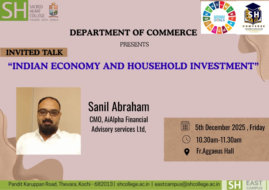 The Department of Commerce presents an invited talk on “Indian Economy and Household Investment” by Sanil Abraham, CMO of AiAlpha Financial Advisory Services Ltd. The session will be held on Friday, 5th December 2025, from 10:30 AM to 11:30 AM at Fr. Aggaeus Hall.