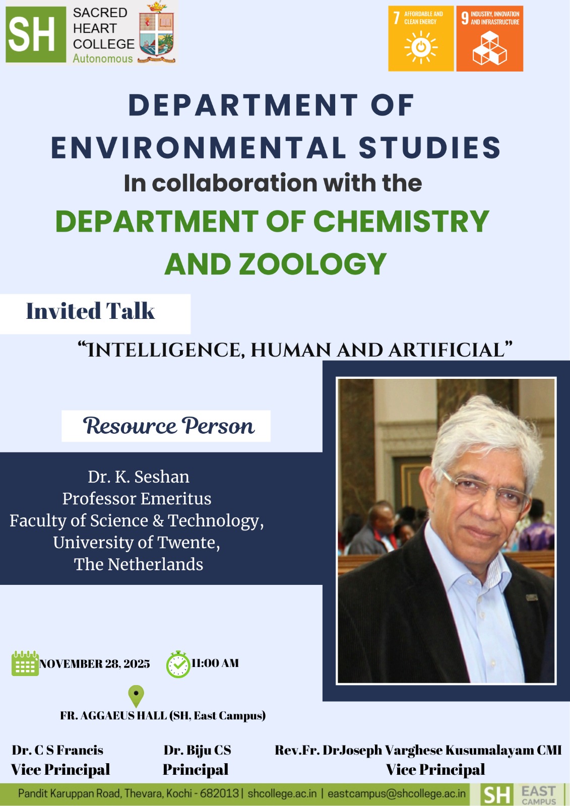 The Department of Environmental Studies, in collaboration with the Departments of Chemistry and Zoology, is organizing an invited talk on “Intelligence, Human and Artificial.” The session will be led by Dr. K. Seshan, Professor Emeritus, Faculty of Science & Technology, University of Twente, The Netherlands. The event will be held on November 28, 2025, at 11:00 AM in Fr. Aggaeus Hall, SH East Campus.