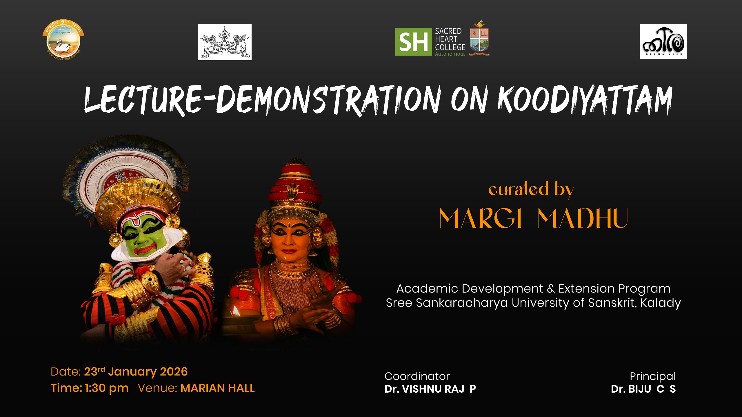 A lecture–demonstration on Koodiyattam, curated by Margi Madhu, was organised as part of the Academic Development and Extension Programme of Sree Sankaracharya University of Sanskrit, Kalady, on 23 January 2026 at 1:30 pm in Marian Hall. The programme was coordinated by Dr. Vishnu Raj P and held under the leadership of the Principal, Dr. Biju C. S. The session offered an enriching engagement with the aesthetics, traditions, and performative techniques of the classical Sanskrit theatre form.