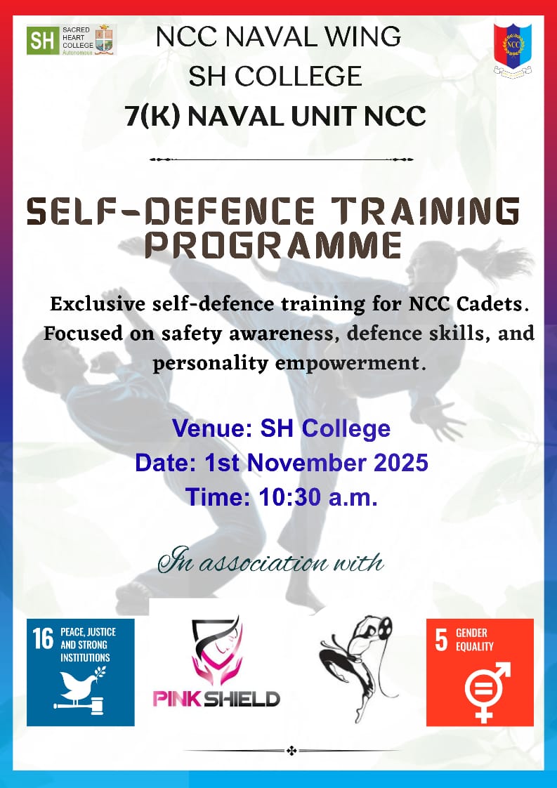 The 7(K) Naval Unit NCC at Sacred Heart College is organizing an exclusive Self-Defence Training Programme for NCC cadets. This session aims to enhance safety awareness, equip participants with essential defence skills, and foster overall personality empowerment. The programme will be held at SH College on 1st November 2025 at 10:30 a.m.