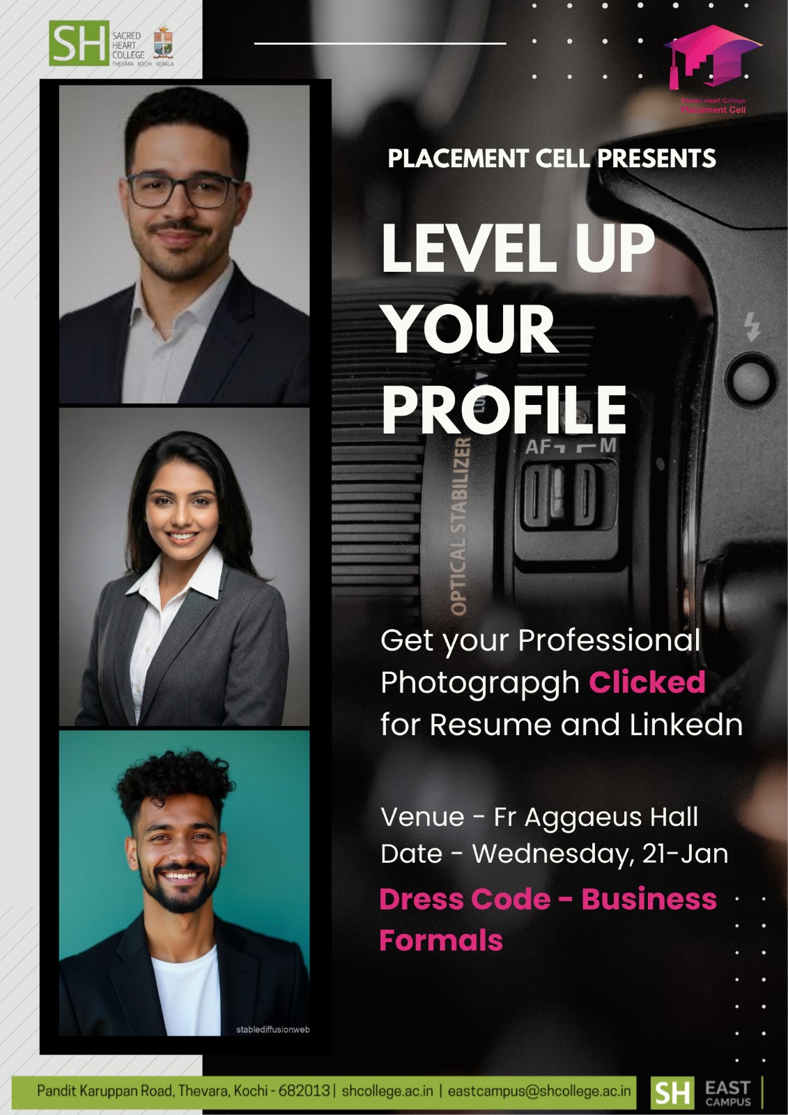 The Placement Cell invites students to enhance their professional presence through AF-M Optical Stabilizer, an initiative designed to help you get a high-quality professional photograph for your resume and LinkedIn profile. The session will be held at Fr. Aggaeus Hall on Wednesday, 21 January. Participants are requested to adhere to the dress code of business formals to ensure a polished and professional appearance.