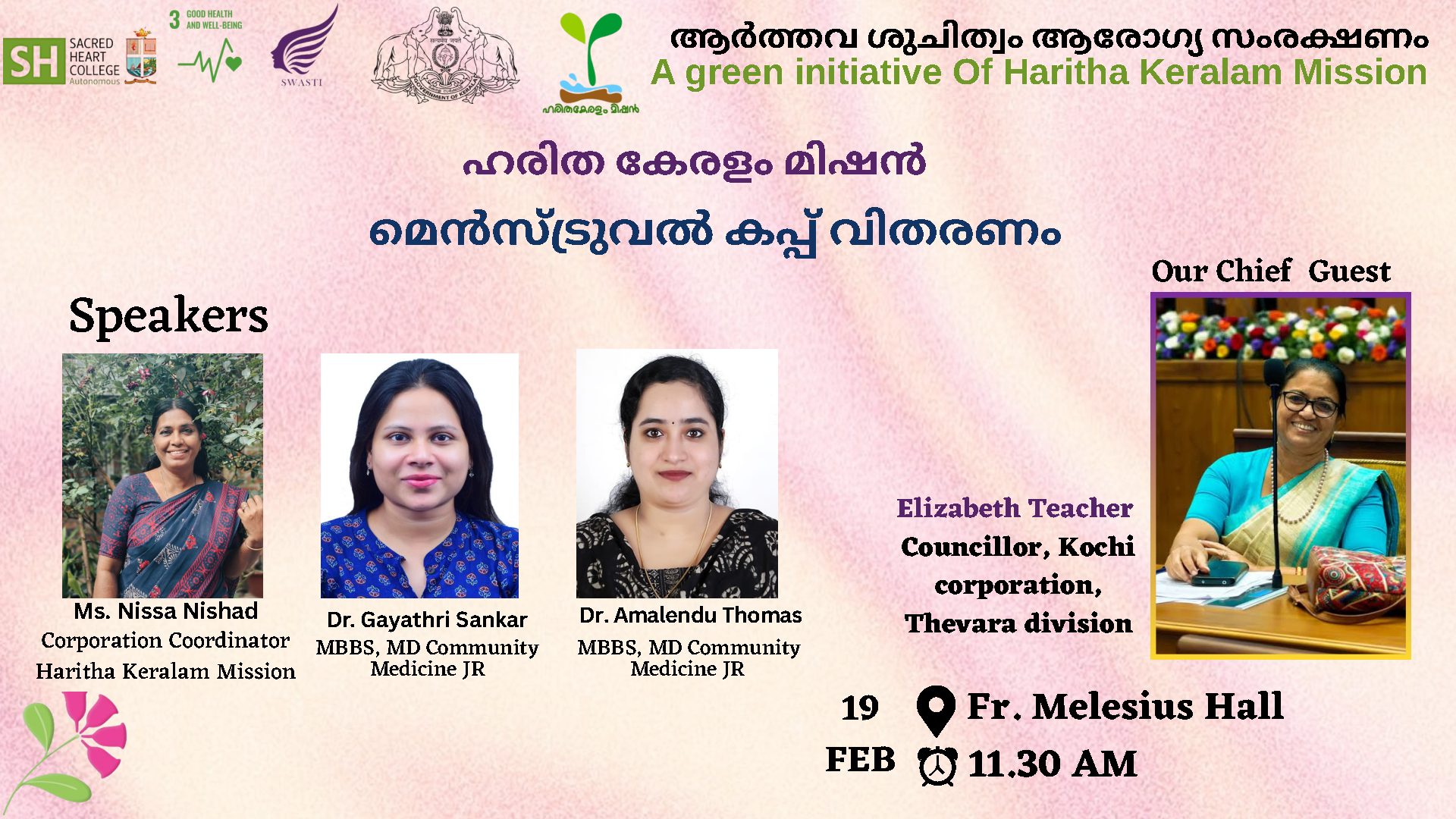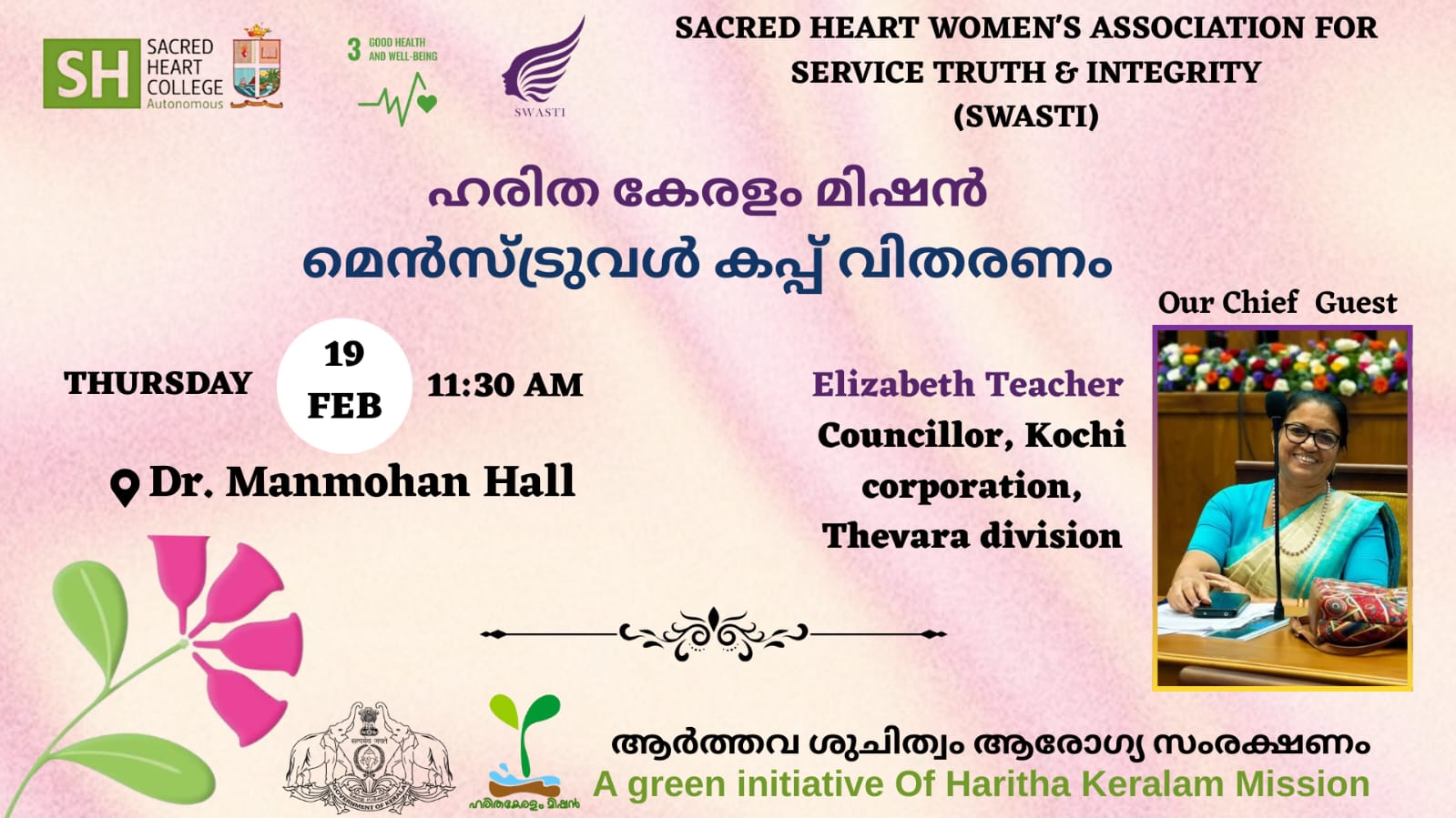 The Sacred Heart Women’s Association for Service, Truth & Integrity (SWASTI) is organising a Menstrual Cup Distribution Programme as part of the Haritha Keralam Mission’s green initiative promoting menstrual hygiene and sustainable health practices. The programme will be held on Thursday, 19 February at 11:30 AM at Dr. Manmohan Hall.