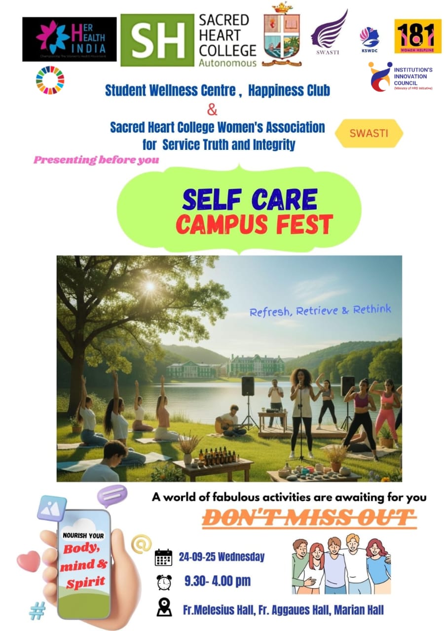 The Self Care Campus Fest is scheduled for Wednesday, September 24, 2025. The day kicks off with a variety of events, including "Hormones Unplugged," a talk by Dr. Jaga Jayadas, an expert in obstetrics and gynaecology from Aster Medcity, Kochi, from 9:30 AM to 10:30 AM at Fr. Melesius Hall. Following this, from 11:30 AM to 12:30 PM, Mr. Sarath Thenmoola, a mental health expert from Ayanika Society, will lead a session at the same hall on "Guiding young individuals towards Mental & Emotional well being." The afternoon features an "Experiential Therapy" session on "Creativity in Mental Health" led by certified art therapist Meghna Girish from 2:30 PM to 3:30 PM at Fr. Aggaues Hall, East Campus. Throughout the day, from 11:00 AM to 4:00 PM, attendees can also enjoy "Retail Therapy," where entrepreneurs will be showcasing their products and services. Additionally, from 9:30 AM to 4:00 PM, Preventive Health Screening will be available at Marian Hall, offering free diagnostic tests for sugar, cholesterol, and blood pressure, along with free eye and dental check-ups provided by Medi vision Diagnostic centre and Dr. Agarwal's Clinic.