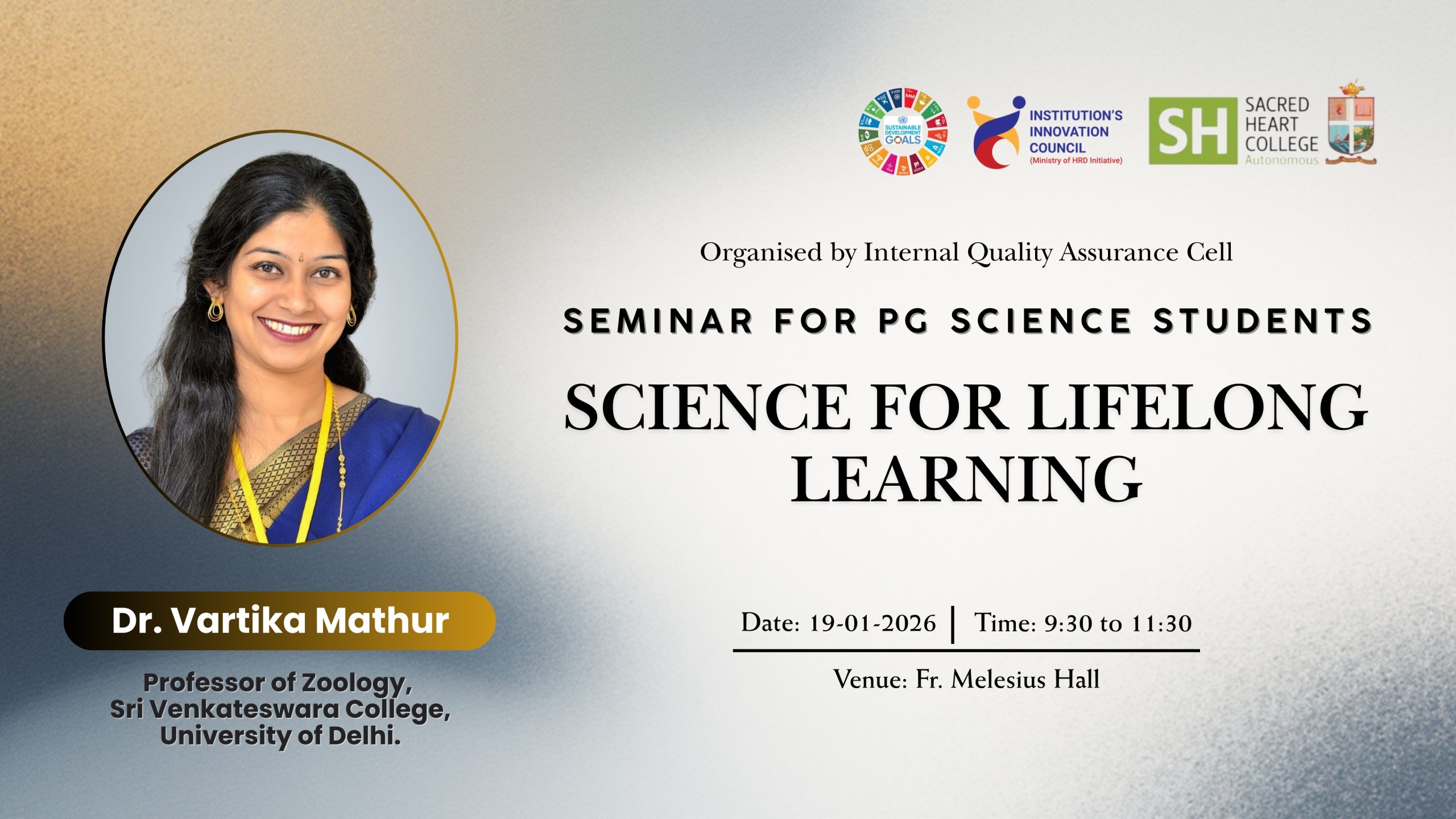 The Internal Quality Assurance Cell (IQAC) organised a seminar for PG Science students on the theme “Science for Lifelong Learning” on 19 January 2026, from 9:30 AM to 11:30 AM at Fr. Melesius Hall. The session was led by Dr. Vartika Mathur, Professor of Zoology, Sri Venkateswara College, University of Delhi, who shared insightful perspectives on the role of science in fostering continuous learning, critical thinking, and academic growth among postgraduate students.