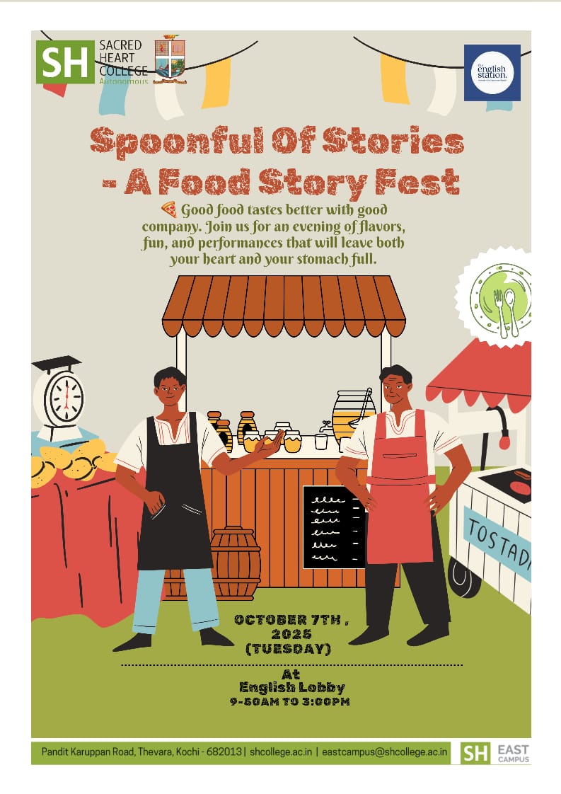Join us for "Spoonful Of Stories - A Food Story Fest," an evening of flavors, fun, and performances where "Good food tastes better with good company." This delightful event will take place on October 7th, 2025 (Tuesday), at the English Lobby from 9:50 AM to 3:00 PM. Don't miss this chance to fill both your heart and your stomach! The event is organized by East Campus, Sacred Heart College (Autonomous), Thevara.