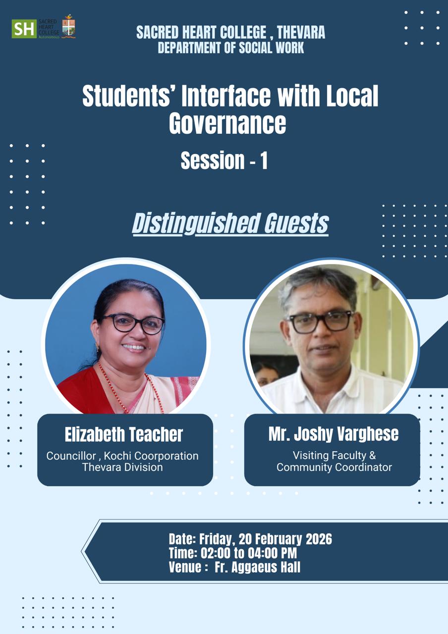 The Department of Social Work, Sacred Heart College, Thevara, organizes Students’ Interface with Local Governance – Session I on Friday, 20 February 2026, from 02:00 PM to 04:00 PM at Fr. Aggaeus Hall. The session will feature distinguished guests, Elizabeth Teacher, Councillor, Kochi Corporation – Thevara Division, and Joshy Varghese, Visiting Faculty & Community Coordinator. The programme aims to provide students with meaningful insights into local governance, civic engagement, and community-level administration.