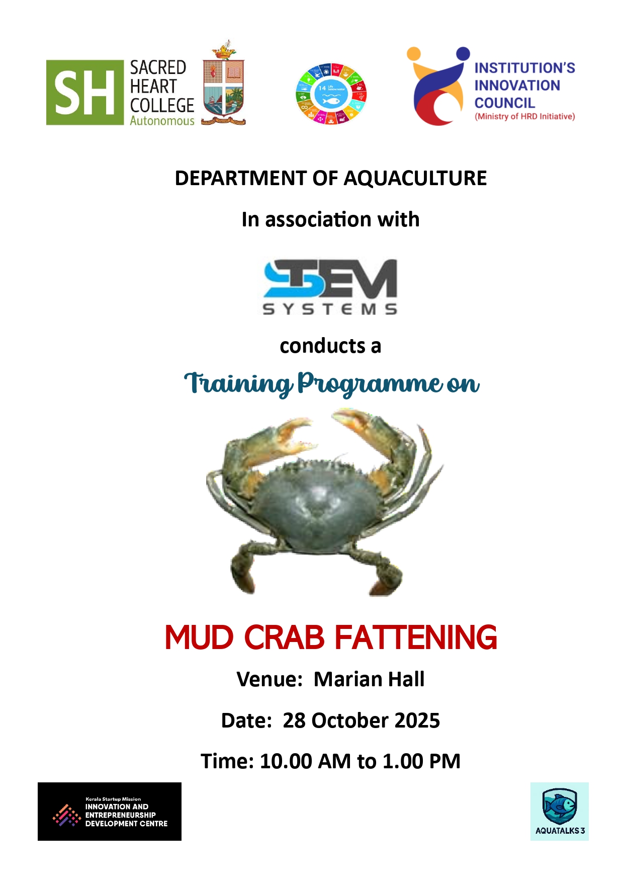 The Department of Aquaculture at Sacred Heart College (Autonomous), in association with STEM Systems, is conducting a Training Programme on Mud Crab Fattening. This educational event is scheduled for 28 October 2025 and will take place at Marian Hall from 10:00 AM to 1:00 PM. The programme is also supported by the Institution's Innovation Council (Ministry of HRD Initiative) and the Kerala Startup Mission-supported Innovation and Entrepreneurship Development Centre.