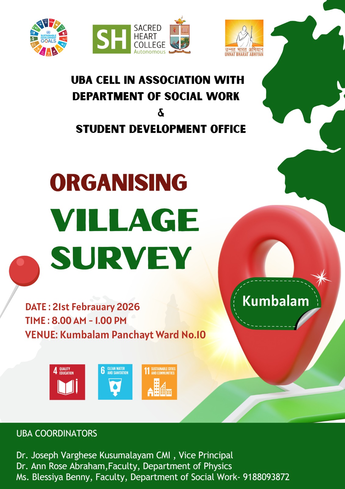 The UBA Cell, in association with the Department of Social Work and the Student Development Office, is organizing a Village Survey on 21st February 2026 from 8:00 AM to 1:00 PM at Kumbalam Panchayat, Ward No. 10. The initiative aims to engage students in community-based research and rural development activities, fostering a deeper understanding of local governance, socio-economic conditions, and participatory planning at the grassroots level.