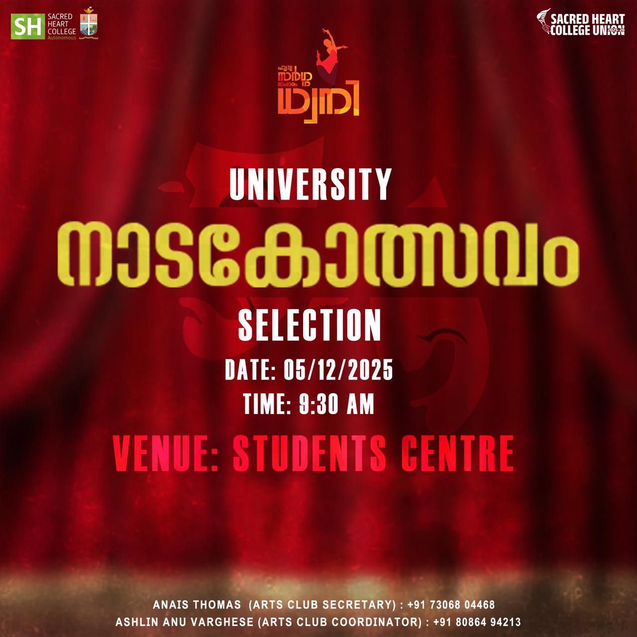 The University Natakolsavam Selection will be held on 05 December 2025 at 9:30 AM in the Students’ Centre. All participants are requested to be present on time for the selection process.