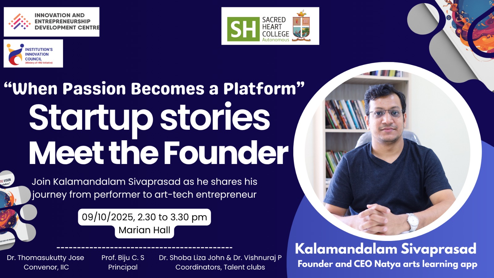 Sacred Heart College, Autonomous, along with the Innovation and Entrepreneurship Development Centre (IEDC) and Institution's Innovation Council (IIC), invites you to an inspiring session, "When Passion Becomes a Platform: Startup stories - Meet the Founder." Join Kalamandalam Sivaprasad, Founder and CEO of Natya arts learning app, as he shares his journey from performer to art-tech entrepreneur. The event is scheduled for 09/10/2025 from 2:30 to 3:30 pm in Marian Hall. The session is convened by Dr. Thomasukutty Jose (Convenor, IIC) and supported by Prof. Biju C. S. (Principal) and Dr. Shoba Liza John & Dr. Vishnuraj P (Coordinators, Talent clubs).