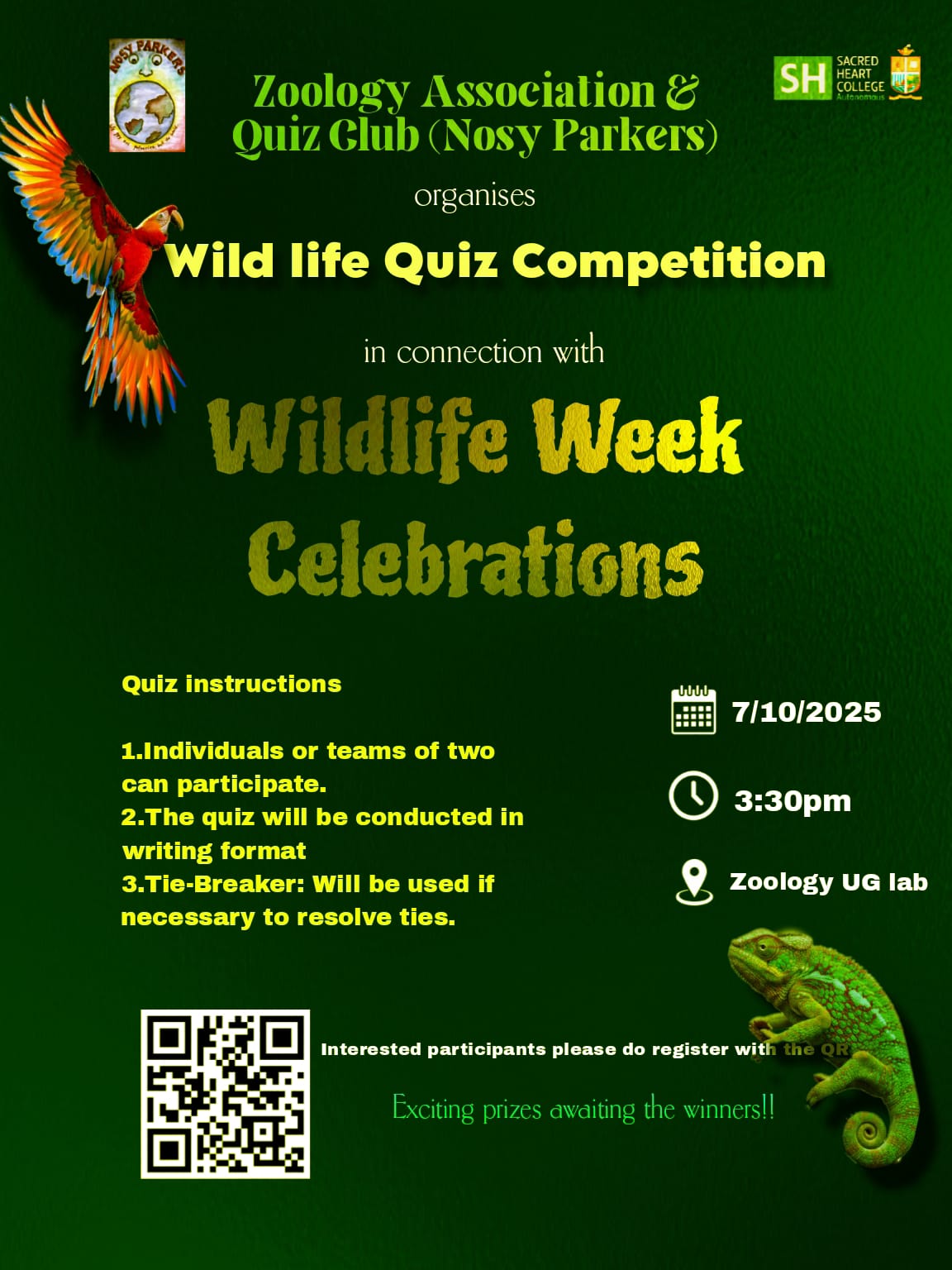 Get ready for an exciting event! The Zoology Association & Quiz Club (Nosy Parkers) is organizing a Wild life Quiz Competition in connection with Wildlife Week Celebrations. The competition will take place on 7/10/2025 starting at 3:30 pm in the Zoology UG lab. Participation is open to individuals or teams of two, and the quiz will be conducted in a writing format. A tie-breaker will be used if necessary to resolve ties. Interested participants, please register using the provided QR code. Don't miss out—Exciting prizes are awaiting the winners!