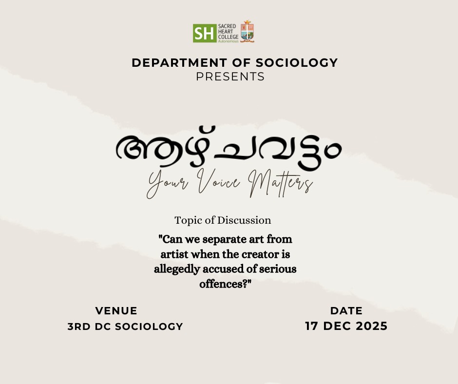 The Department of Sociology presents “ആഴ്ചവട്ടം – Your Voice Matters”, an interactive discussion forum that encourages critical thinking and open dialogue. The session will explore the thought-provoking topic, “Can we separate art from the artist when the creator is allegedly accused of serious offences?” The discussion will be held on…