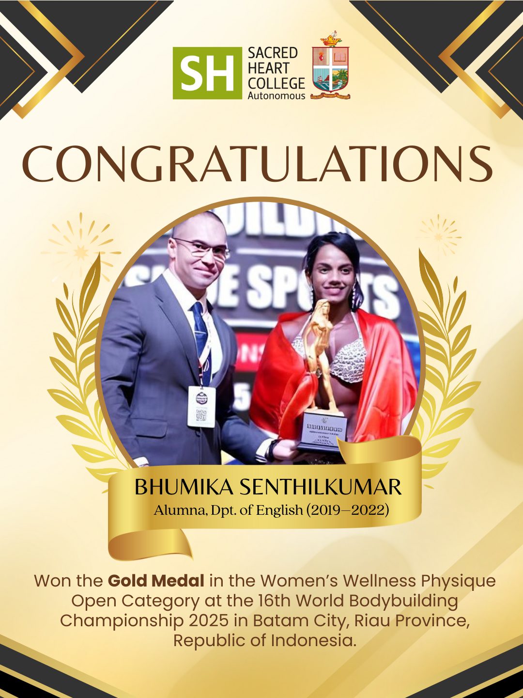 Congratulations to Bhumika Senthilkumar, Alumna, Department of English (2019–2022), who won the Gold Medal in the Women’s Wellness Physique Open Category at the 16th World Bodybuilding Championship 2025, held in Batam City, Riau Province, Republic of Indonesia.