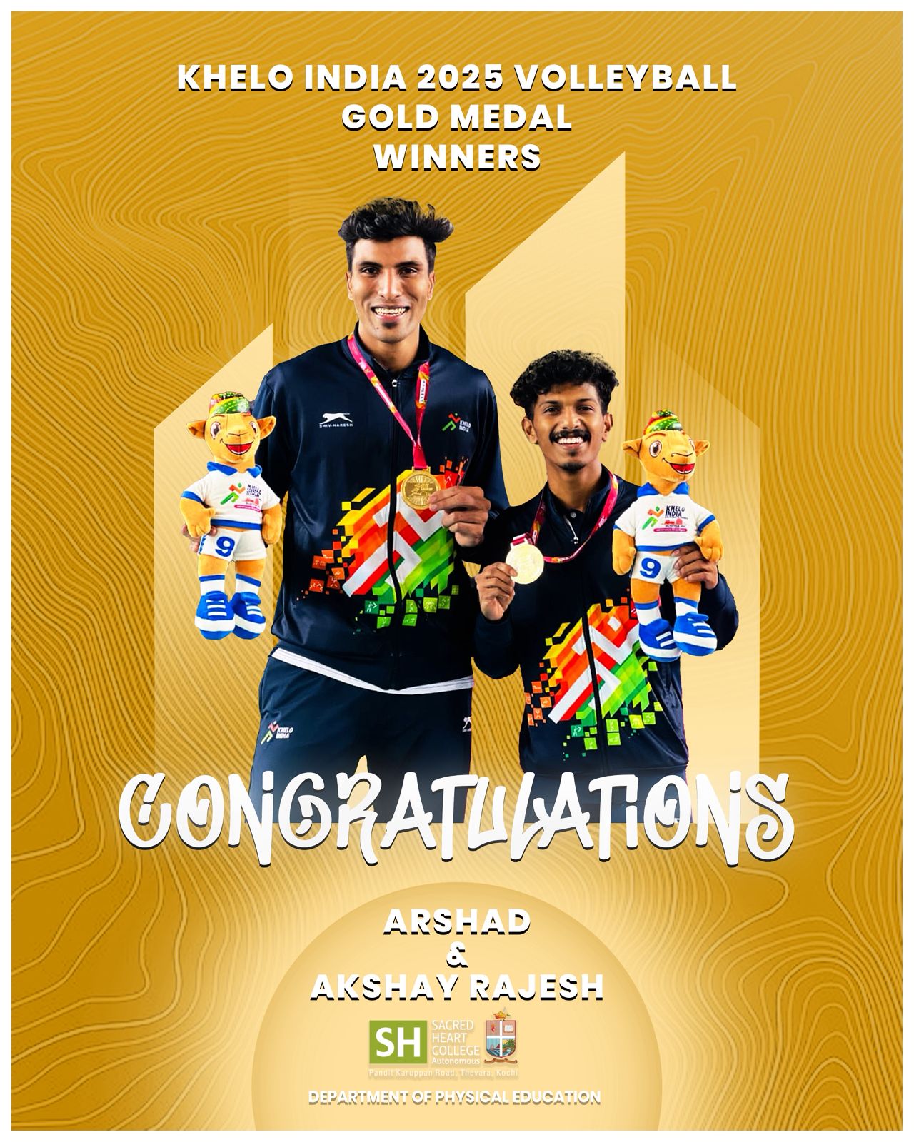 Congratulations to Arshad and Akshay Rajesh from the Department of Physical Education for securing the Gold Medal in Volleyball at Khelo India 2025! Their dedication, skill, and teamwork have brought pride to Sacred Heart College.