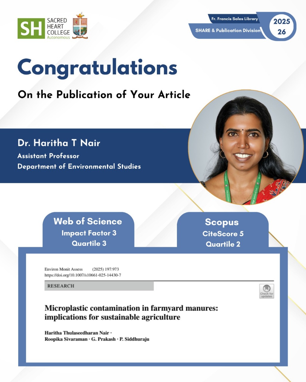 Congratulations to Dr. Haritha T Nair on the publication of her significant research article, 'Microplastic contamination in farmyard manures: implications for sustainable agriculture'! We are incredibly proud of her achievement in having this work recognized in top-tier environmental journals with a Web of Science Impact Factor of 3 and a Scopus CiteScore of 5. This success underscores the high-impact research our Department of Environmental Studies is producing. Well done