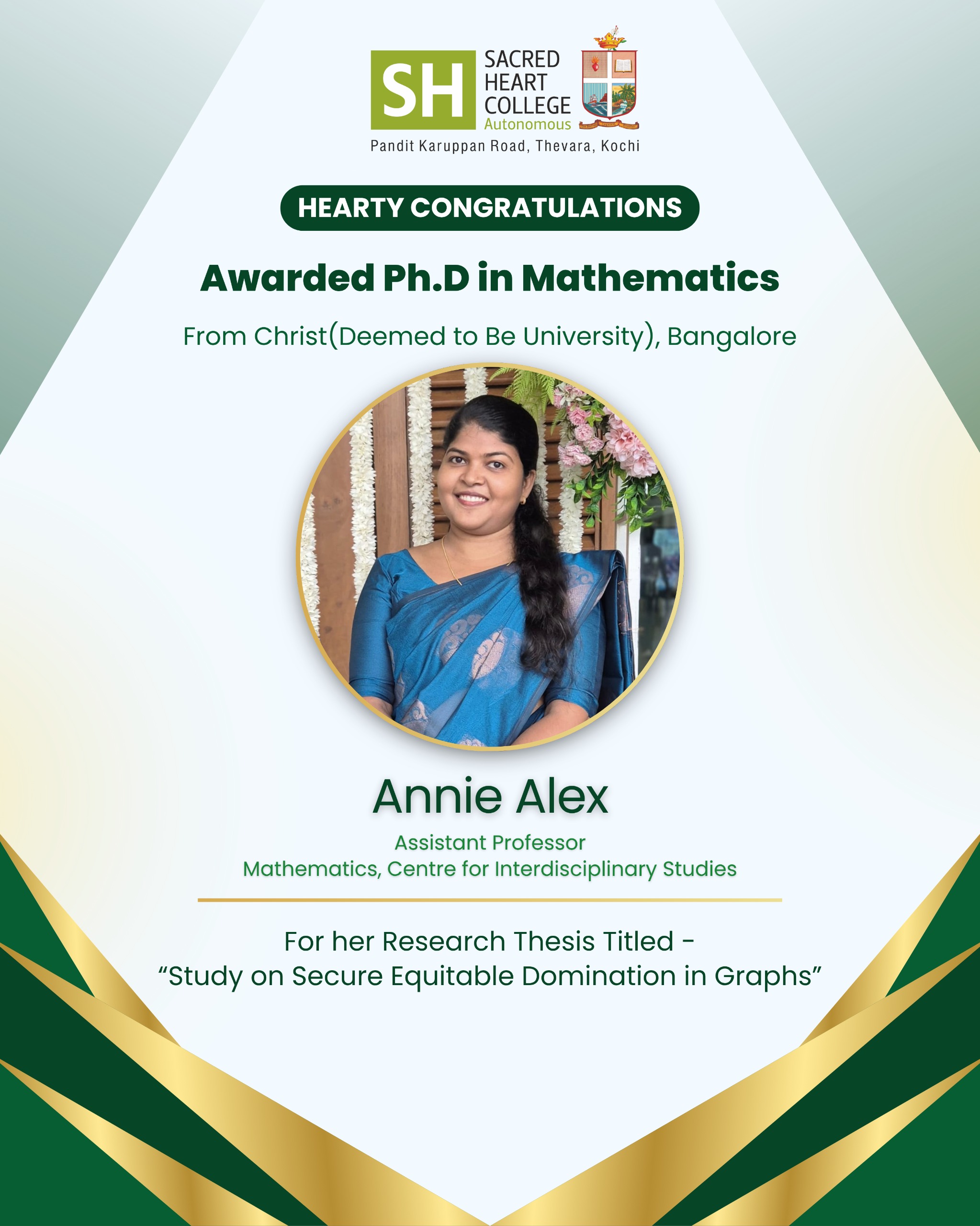Ms. Annie Alex, Assistant Professor of Mathematics at the Centre for Interdisciplinary Studies, has been awarded a Ph.D. in Mathematics from Christ (Deemed to be University), Bangalore. Her doctoral research was titled “Study on Secure Equitable Domination in Graphs.”