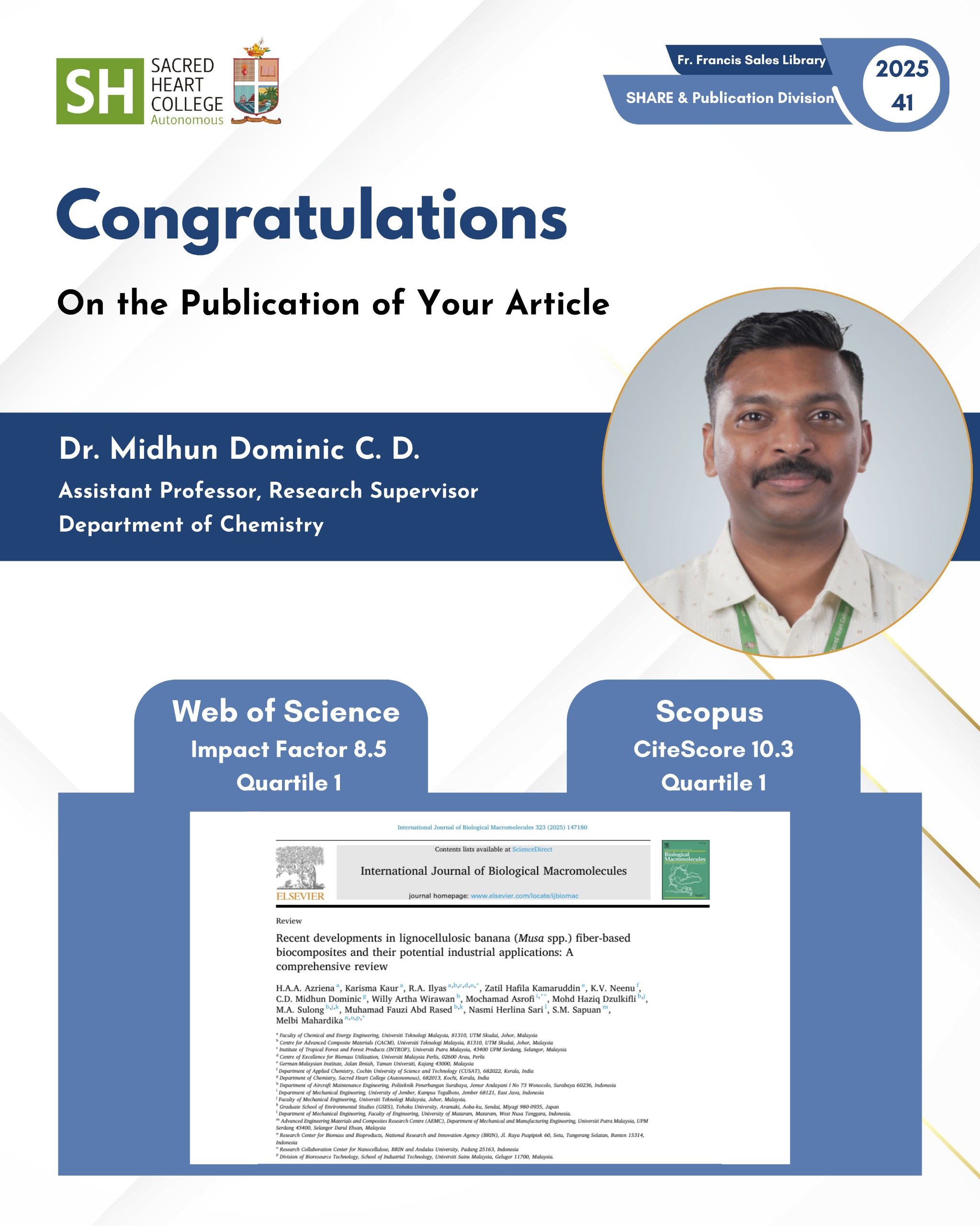 Congratulations to Dr. Midhun Dominic C. D., Assistant Professor and Research Supervisor, Department of Chemistry, on the publication of his research article in the prestigious International Journal of Biological Macromolecules (Web of Science Impact Factor: 8.5, Quartile Q1; Scopus CiteScore: 10.3, Quartile Q1).