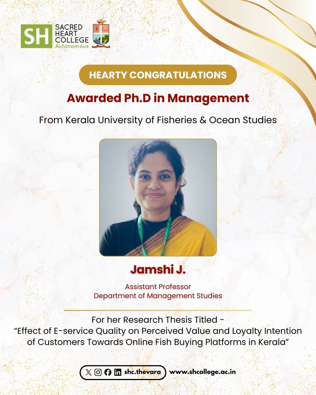 Hearty congratulations to Ms. Jamshi J., Assistant Professor, Department of Management Studies, on being awarded the Ph.D. in Management by the Kerala University of Fisheries and Ocean Studies (KUFOS). She was conferred the doctoral degree for her research thesis titled “Effect of E-service Quality on Perceived Value and Loyalty Intention of Customers Towards Online Fish Buying Platforms in Kerala.” Her achievement is a matter of great pride and inspiration.