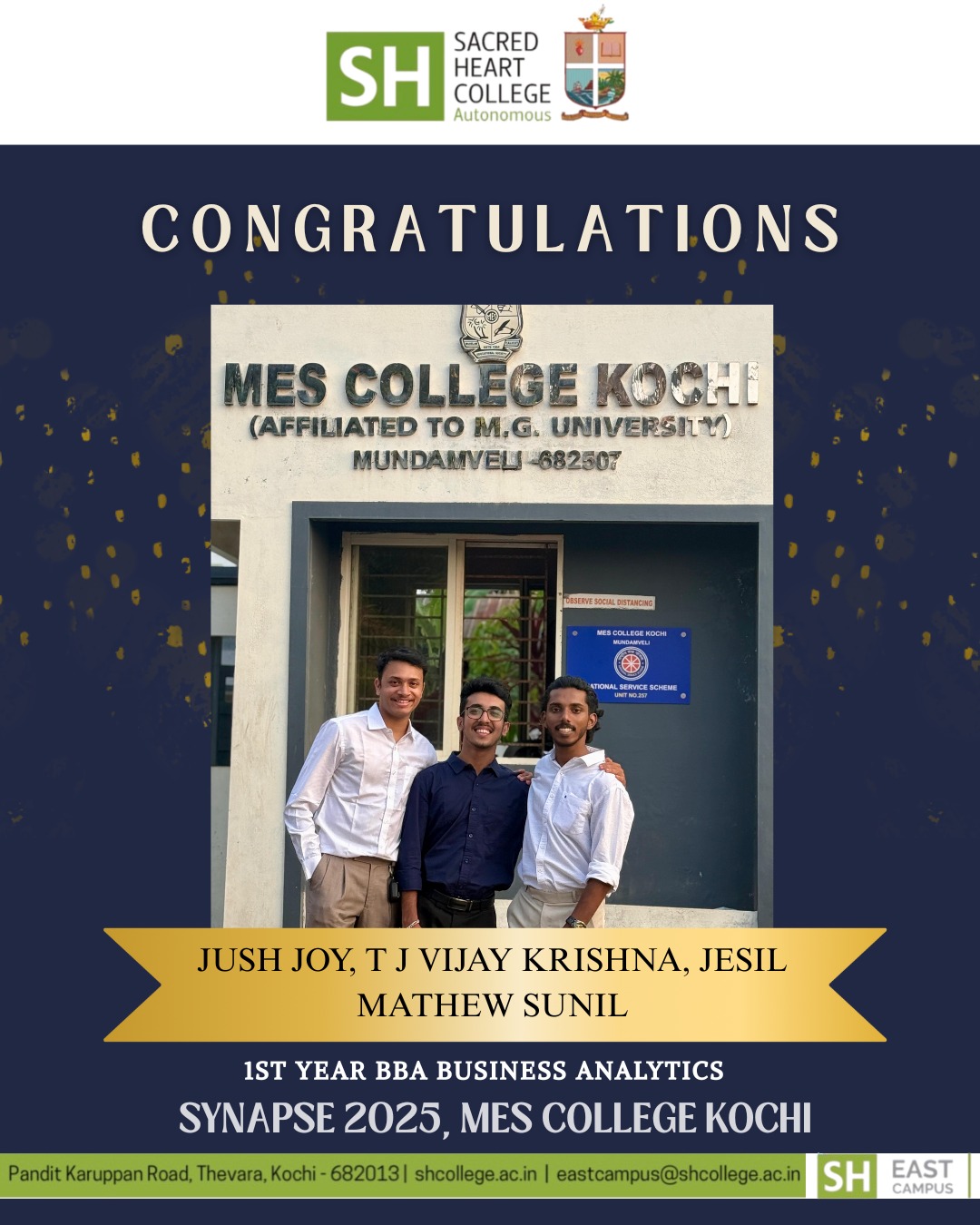 Congratulations to Jush Joy, Jesil Mathew Sunil, and T. J. Vijay Krishna, first-year BBA Business Analytics students, on their commendable achievements at SYNAPSE 2025, held at MES College, Kochi. Jush Joy secured second place in Best Manager, while Jush Joy, Jesil Mathew Sunil, and T. J. Vijay Krishna jointly won second place in HR Games. Adding to the accolades, Jesil Mathew Sunil earned first place in photography. Their accomplishments reflect talent, teamwork, and dedication.