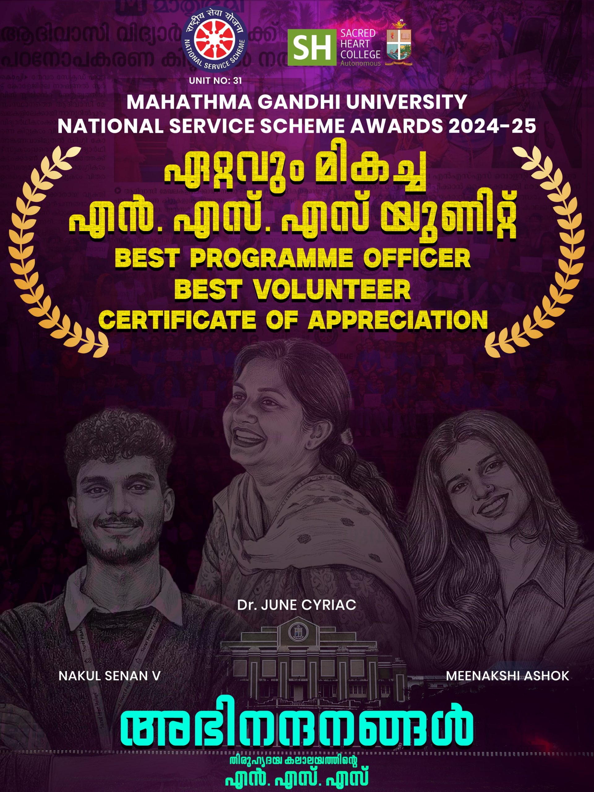 The National Service Scheme (NSS) of Sacred Heart College (Autonomous), Thevara has been honored at the Mahatma Gandhi University NSS Awards 2024–25 for its outstanding contributions to social service and community engagement. The NSS Unit of the college received the award for Best NSS Unit, recognizing its impactful initiatives and dedicated volunteer activities throughout the year. In addition, Dr. June Cyriac was honored as the Best Programme Officer for exemplary leadership and commitment to NSS activities. Further bringing pride to the institution, Nakul Senan V was awarded Best Volunteer, while Meenakshi Ashok received a Certificate of Appreciation for her active involvement and service. Sacred Heart College extends its heartfelt congratulations to the NSS team for these remarkable achievements and for upholding the spirit of service and social responsibility.