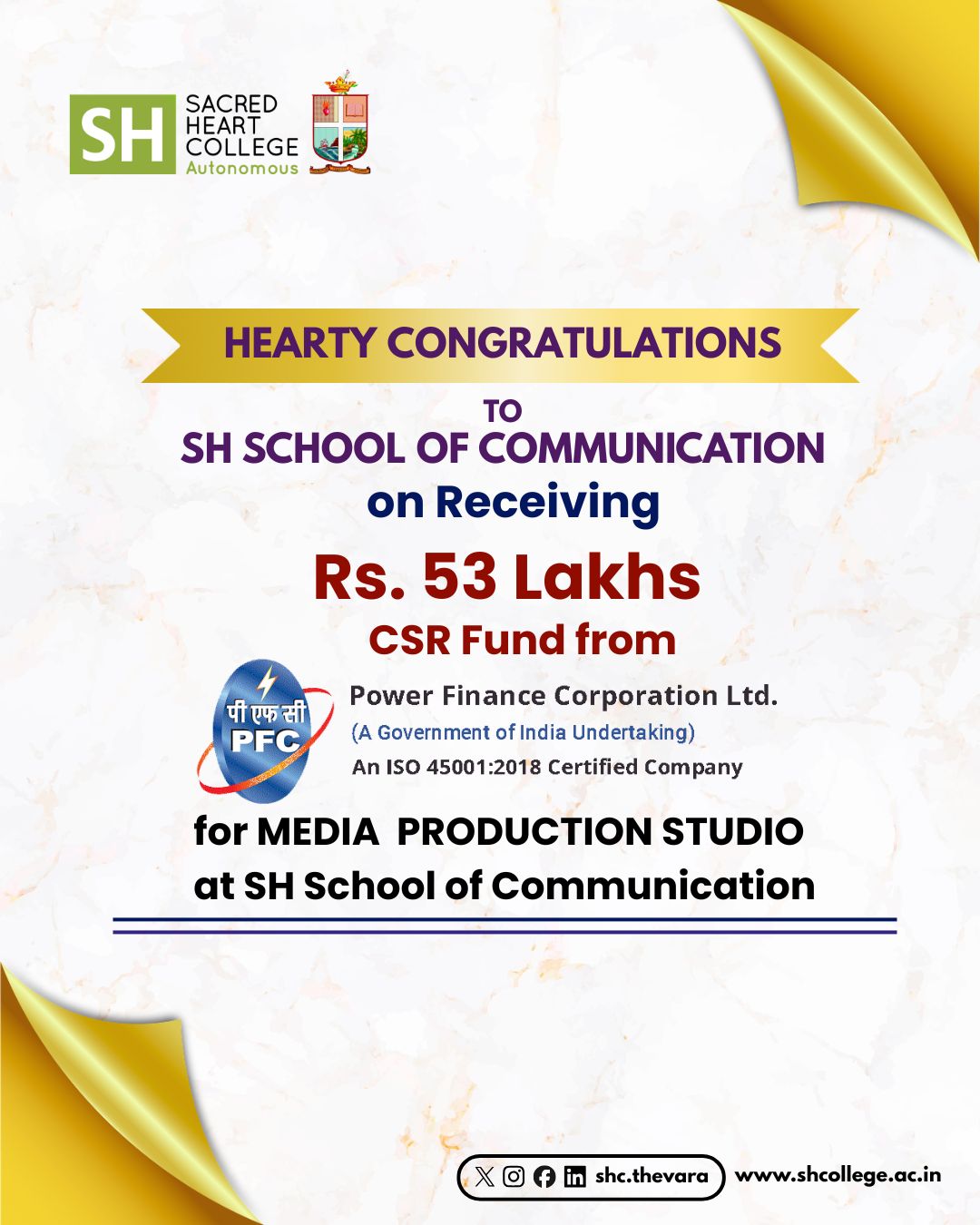 The SH School of Communication proudly celebrates a significant milestone with the receipt of a CSR grant of ₹53 lakhs from Power Finance Corporation Ltd., a Government of India undertaking and an ISO 45001:2018 certified company.