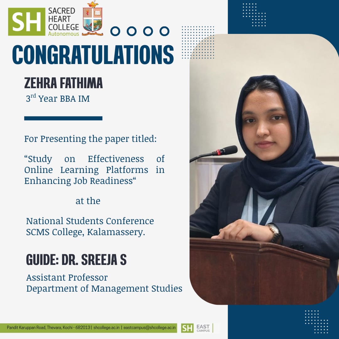 Sacred Heart College proudly congratulates Zehra Fathima, 3rd Year BBA (IM), for successfully presenting her research paper titled “Study on Effectiveness of Online Learning Platforms in Enhancing Job Readiness” at the National Students Conference held at SCMS College.