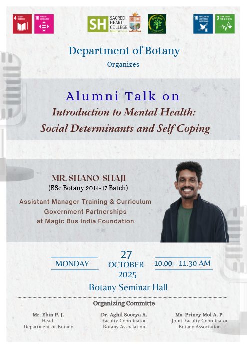 An Alumni Talk on the topic “Introduction to Mental Health: Social Determinants and Self-Coping” was organised by the Department of Botany on 27 October 2025. Mr. Shano Shaji, an alumnus of the department, currently serves as an Assistant Manager at Magic Bus India Foundation. The session aimed to create awareness among students about the importance of mental health and the various social factors that influence it. Shano emphasized the role of community, relationships, and self-awareness in maintaining psychological well-being. He also discussed effective self-coping mechanisms to manage stress and emotional challenges in everyday life.