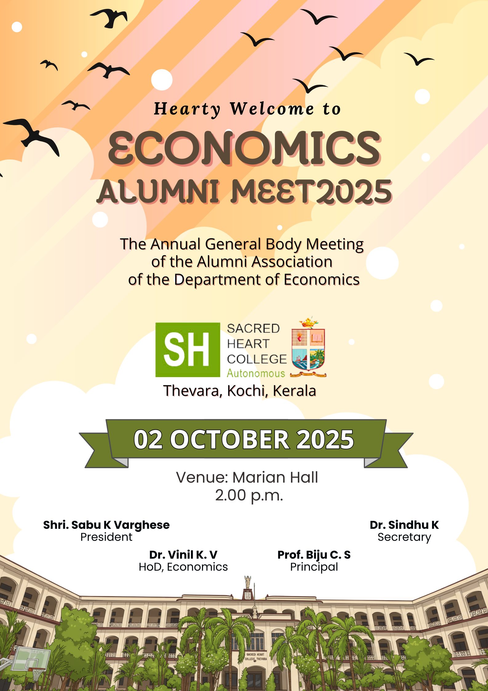 The Economics Alumni Meet 2025, the Annual General Body Meeting of the Alumni Association of the Department of Economics was held on October 2 at Sacred Heart College, Thevara, Kochi. Distinguished alumni, faculty, and students participated in academic and cultural events. Achievers were honoured for accomplishments in academics, research, and sports. The meeting consolidated alumni relations, encouraged mentoring, and featured cultural programmes and networking. Office bearers were re-elected and plans for continued collaboration were discussed.