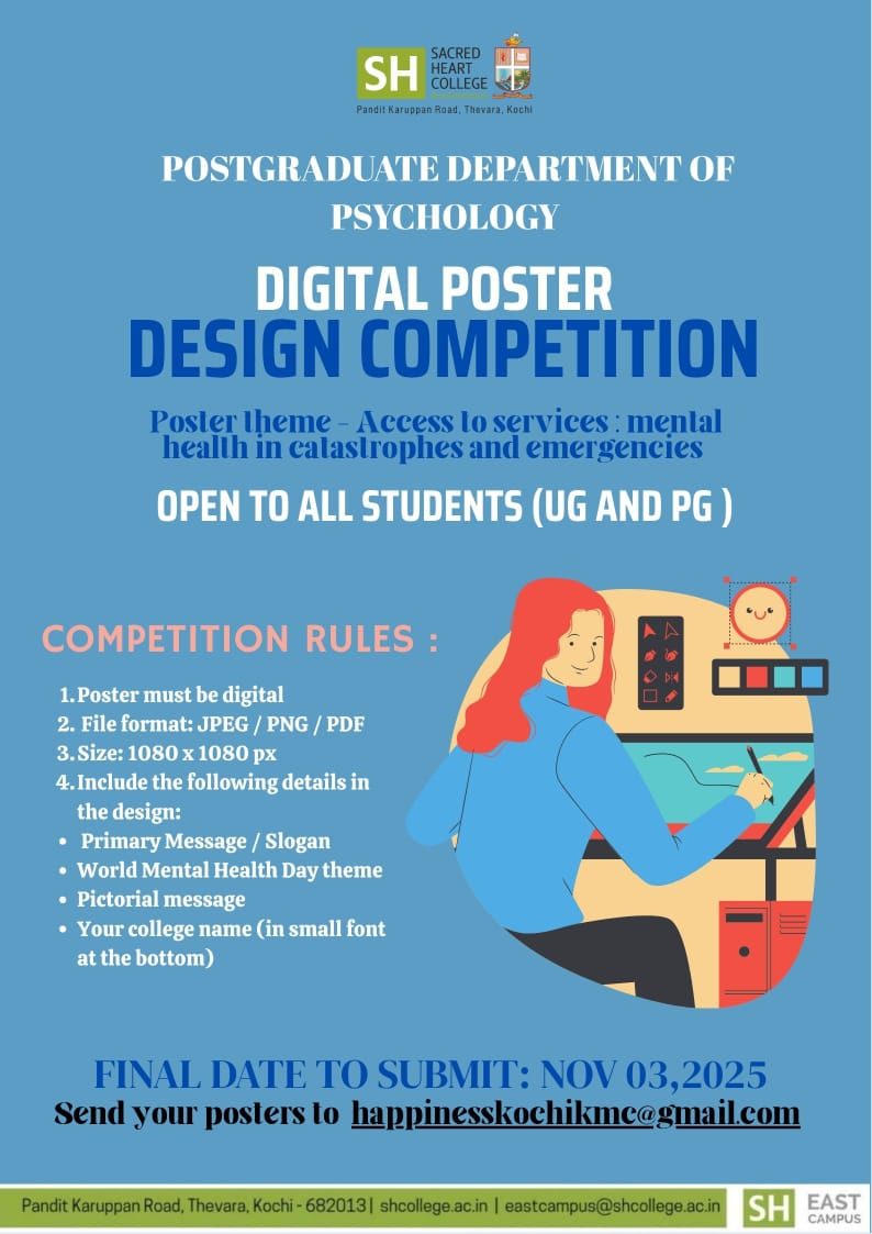 On 3 November 2025, the Department in association with Happiness Kochi hosted a Digital Poster Design Competition centered on the critical theme of "Access to Services: Mental Health in Calamities and Emergencies." Open to both undergraduate and postgraduate students, the event encouraged participants to explore the psychological impact of crises and the importance of accessible support systems through a creative, digital lens. By integrating graphic design with mental health advocacy, the competition successfully highlighted the urgent need for specialized intervention during humanitarian emergencies.